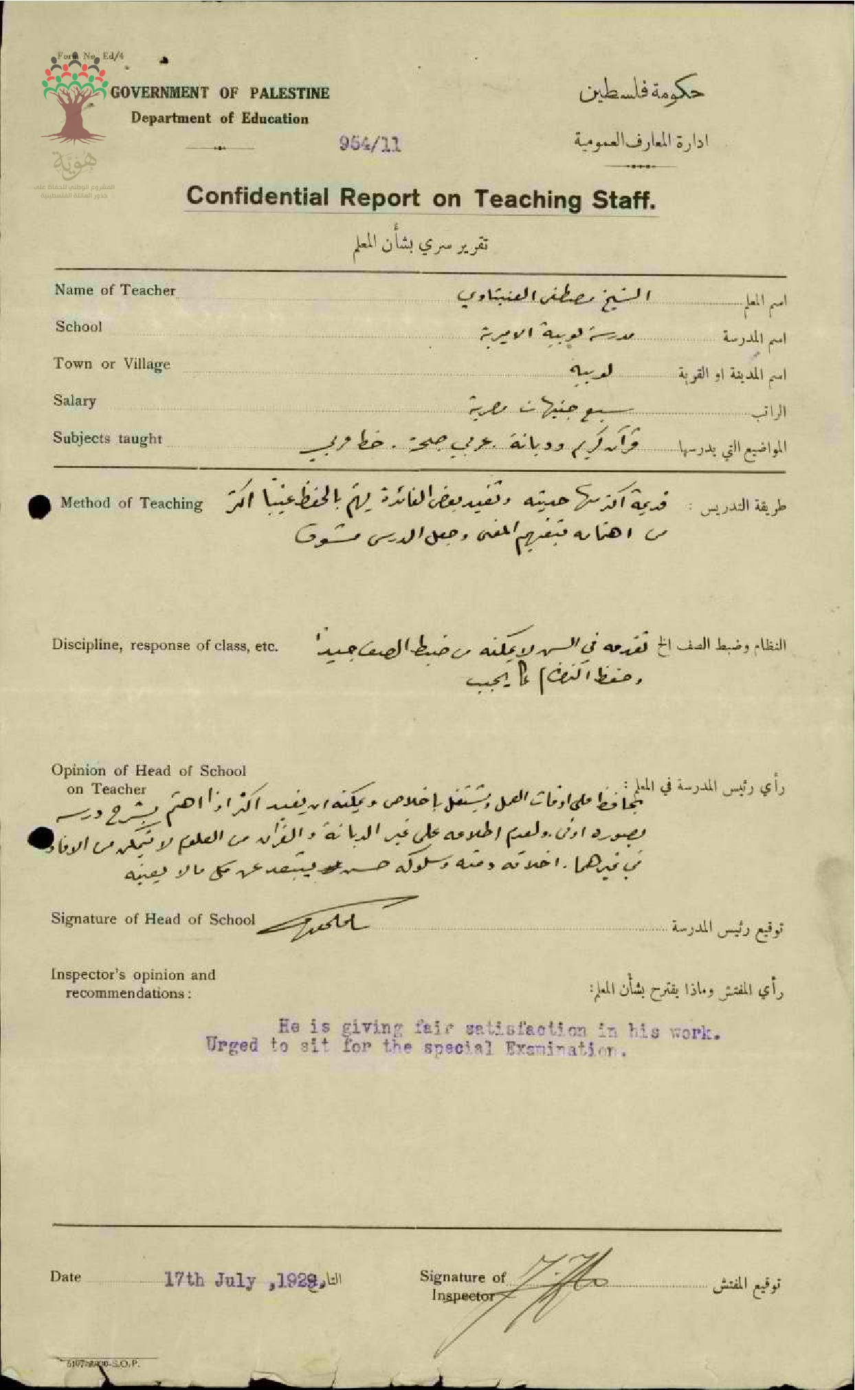 تقرير تفصيلي عن أداء المعلم مصطفى عنبتاوي في مدرسة لوبيا الابتدائية سنة 1929