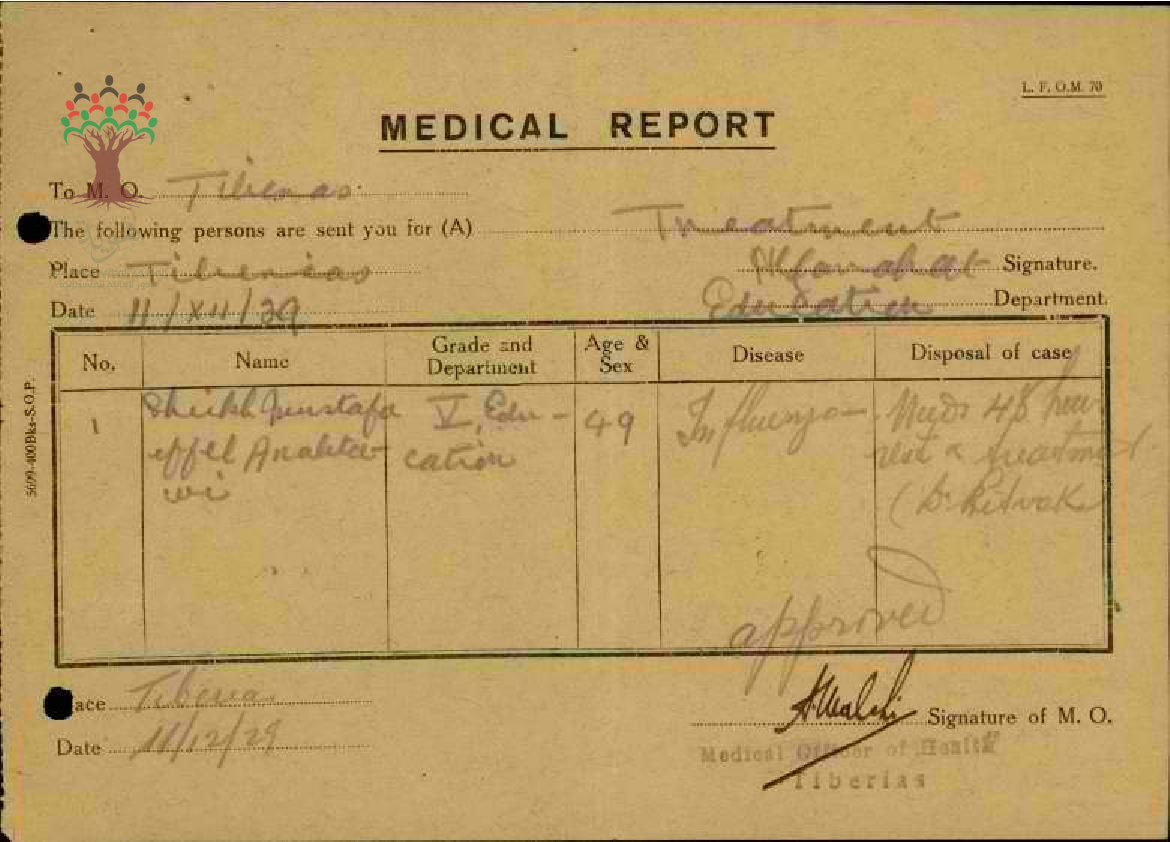رسالة من مدير مدرسة لوبيا الى مفتش المعارف بخصوص تغيب المعلم مصطفى عنبتاوي مرفقة بالتقرير الطبي