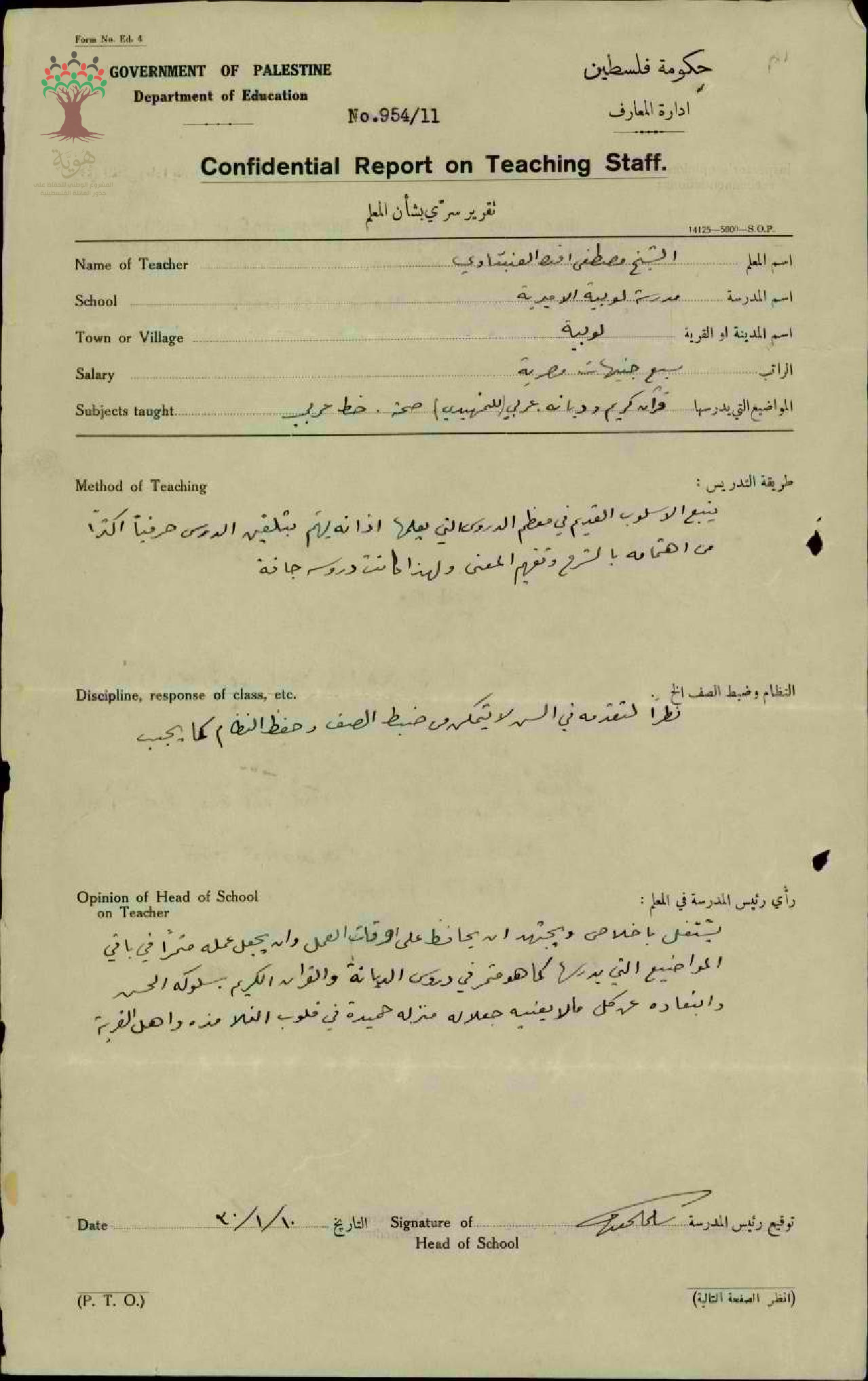 تقرير تفصيلي عن أداء المعلم مصطفى عنبتاوي في مدرسة لوبيا الابتدائية سنة 1929