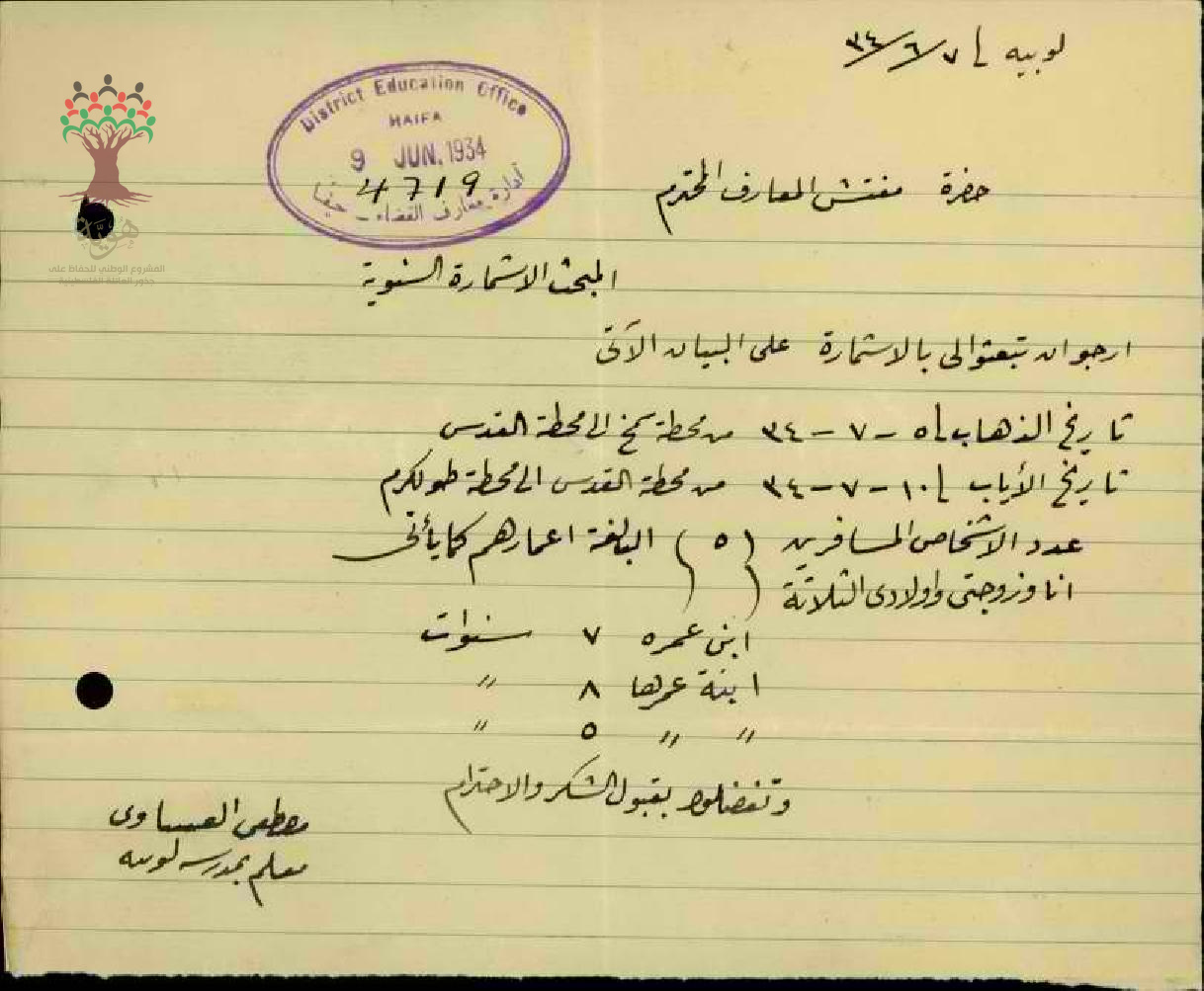 رسالة من المعلم مصطفى عنبتاوي الى مفتش المعارف يطلب فيها استمارة سفره السنوية