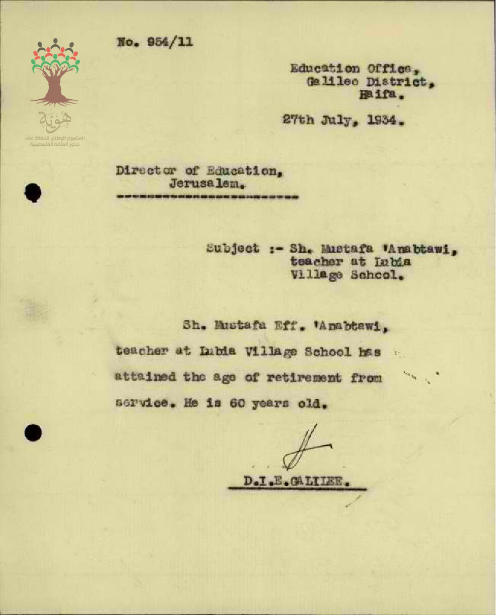 رسالة من مفتش المعارف الى مدير المعارف بخصوص وصول المعلم مصطفى عنبتاوي الى سن التقاعد