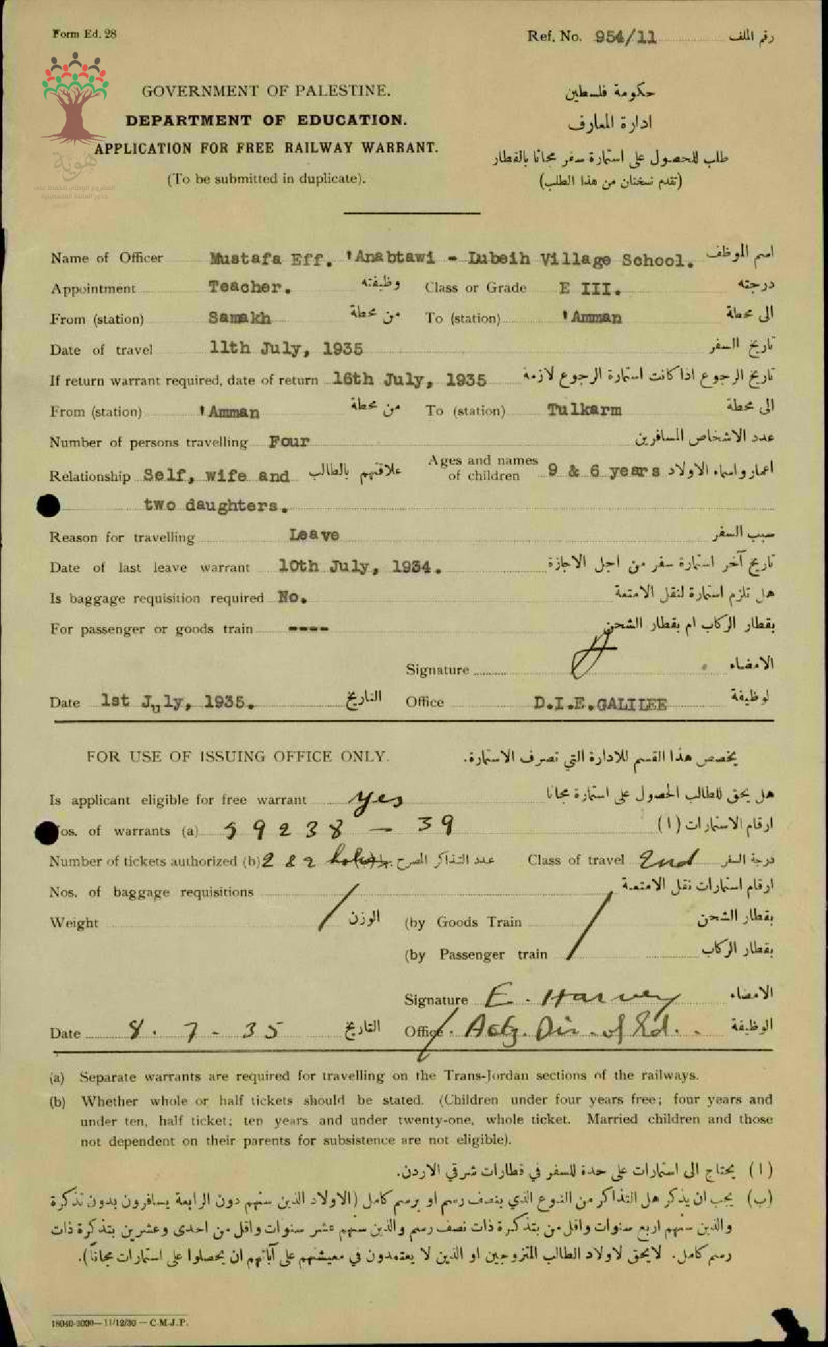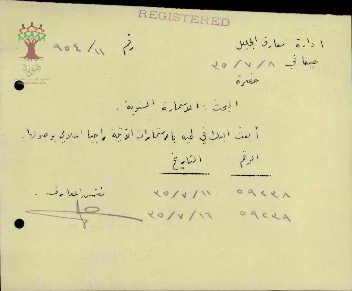 رسالة من مفتش المعارف الى المعلم مصطفى عنبتاوي مرفقة باستمارة سفره