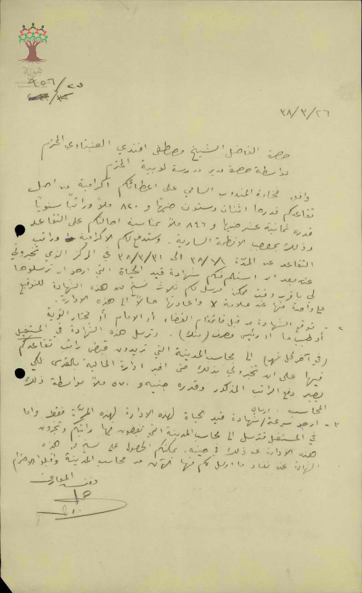 رسائل بخصوص موافقة المندوب السامي على اعطاء المعلم مصطفى عنبتاوي اكرامية انتهاء خدمته
