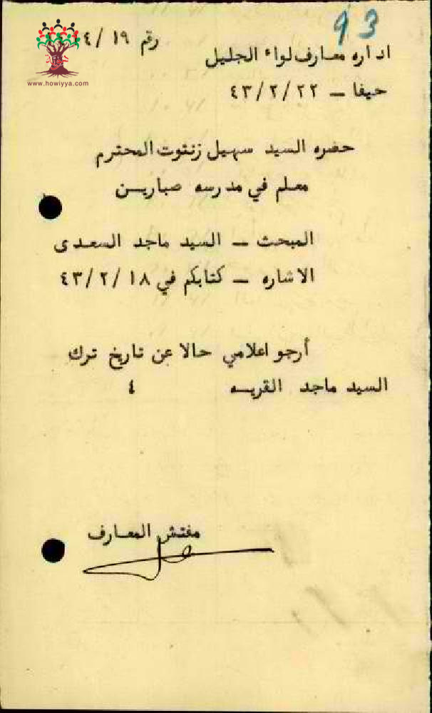 رسالة من المفتش العام الى المعلم سهيل زنتوت يسأله عن المعلم ماجد السعدي - عكا - مدرسة صبارين
