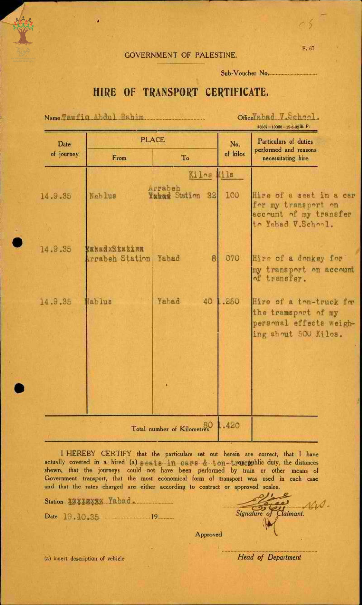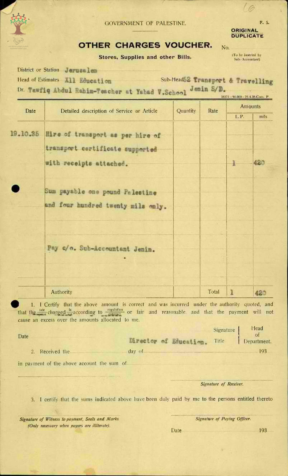 ايصالات بتكاليف تنقل المعلم توفيق عبد الرحيم صادق