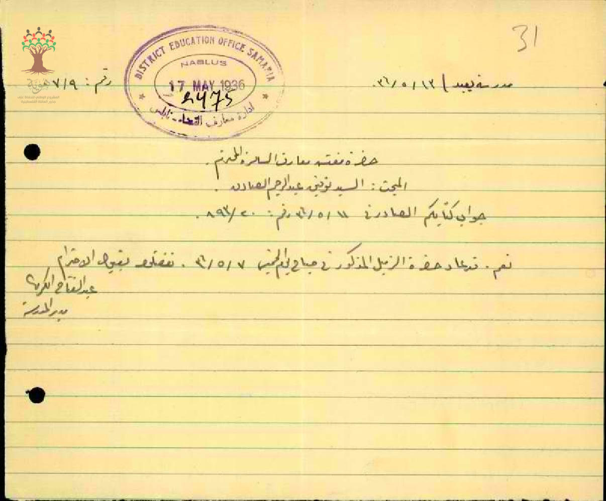 رسالة من مدير مدرسة يعبد الى مفتش المعارف بخصوص عودة المعلم توفيق صادق الى العمل