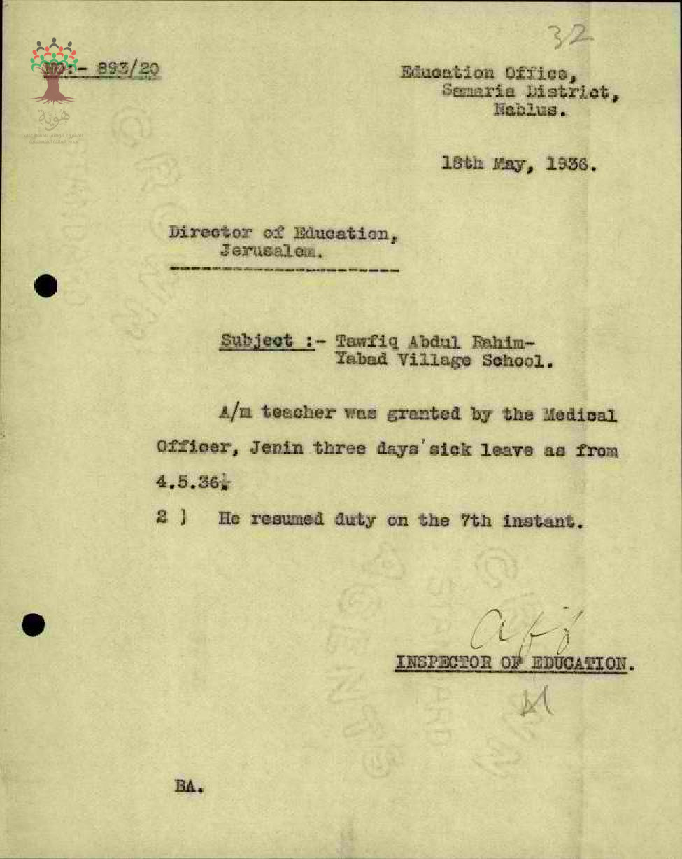 رسالة من مفتش المعارف الى مدير المعارف بخصوص اجازة مرضية للمعلم توفيق صادق وعودته للعمل