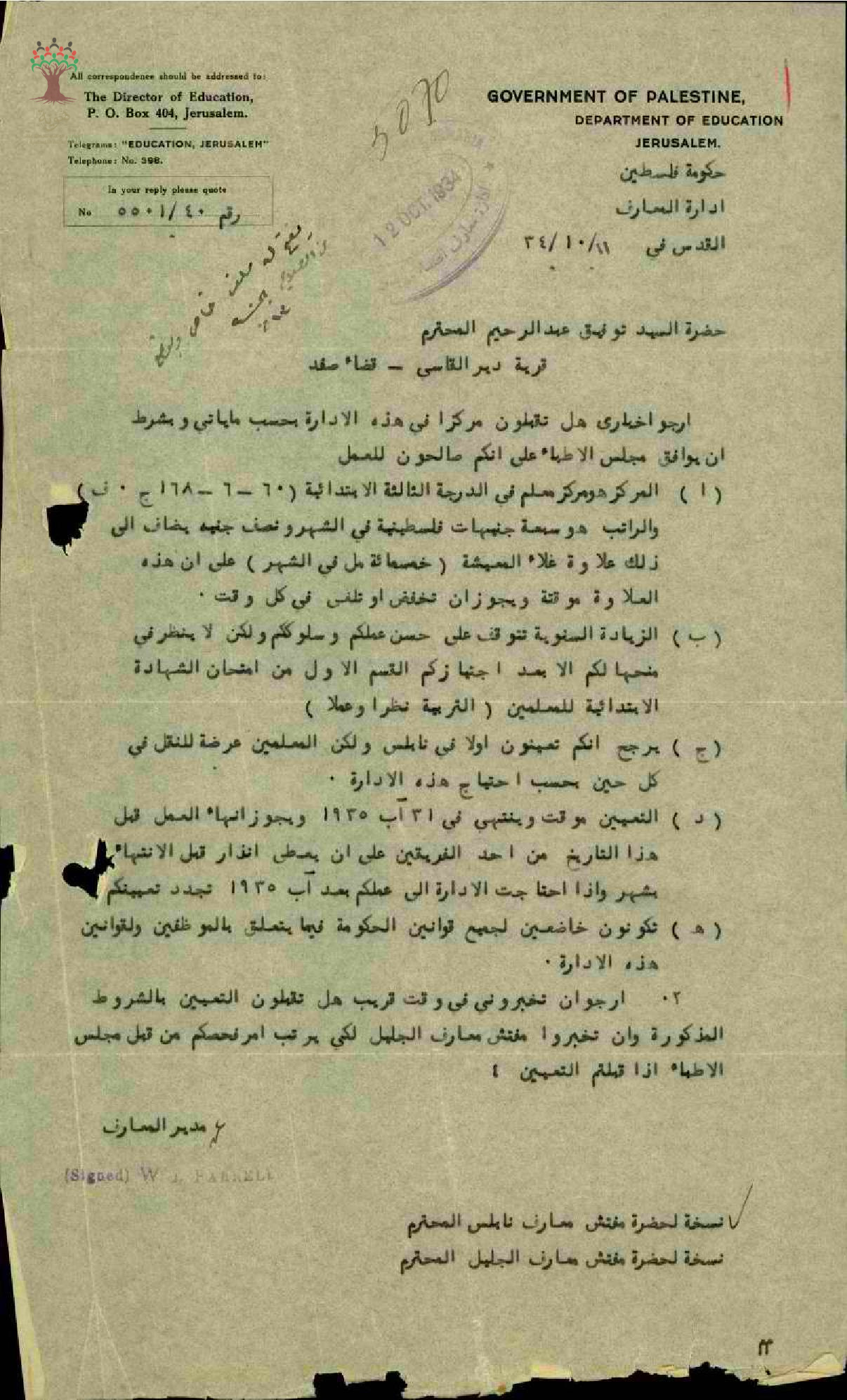 ورقة عرض وشروط عمل للمعلم توفيق عبد الرحيم صادق في مدرسة الصلاحية