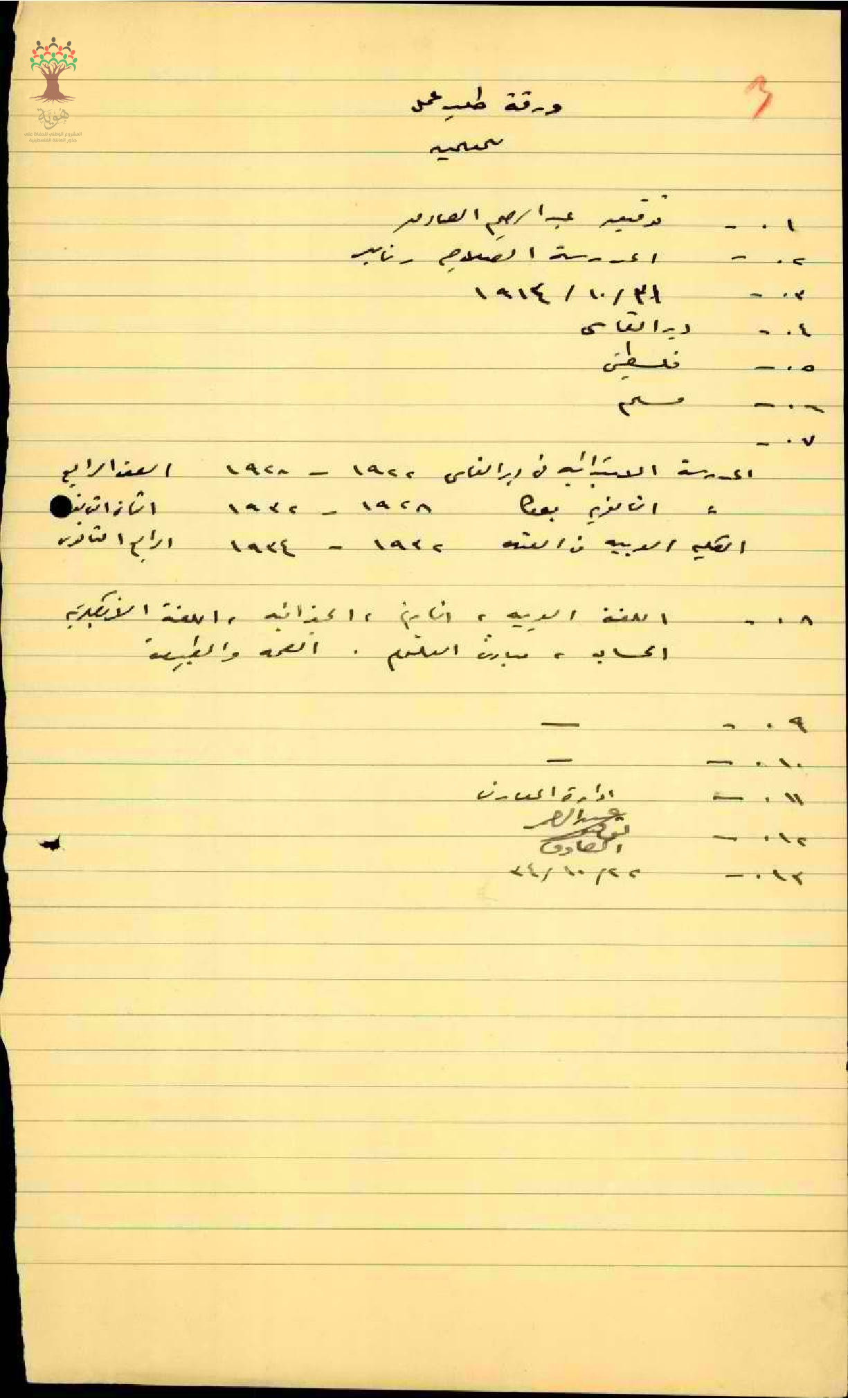 ورقة طلب عمل للمعلم توفيق عبد الرحيم صادق/دير القاسي