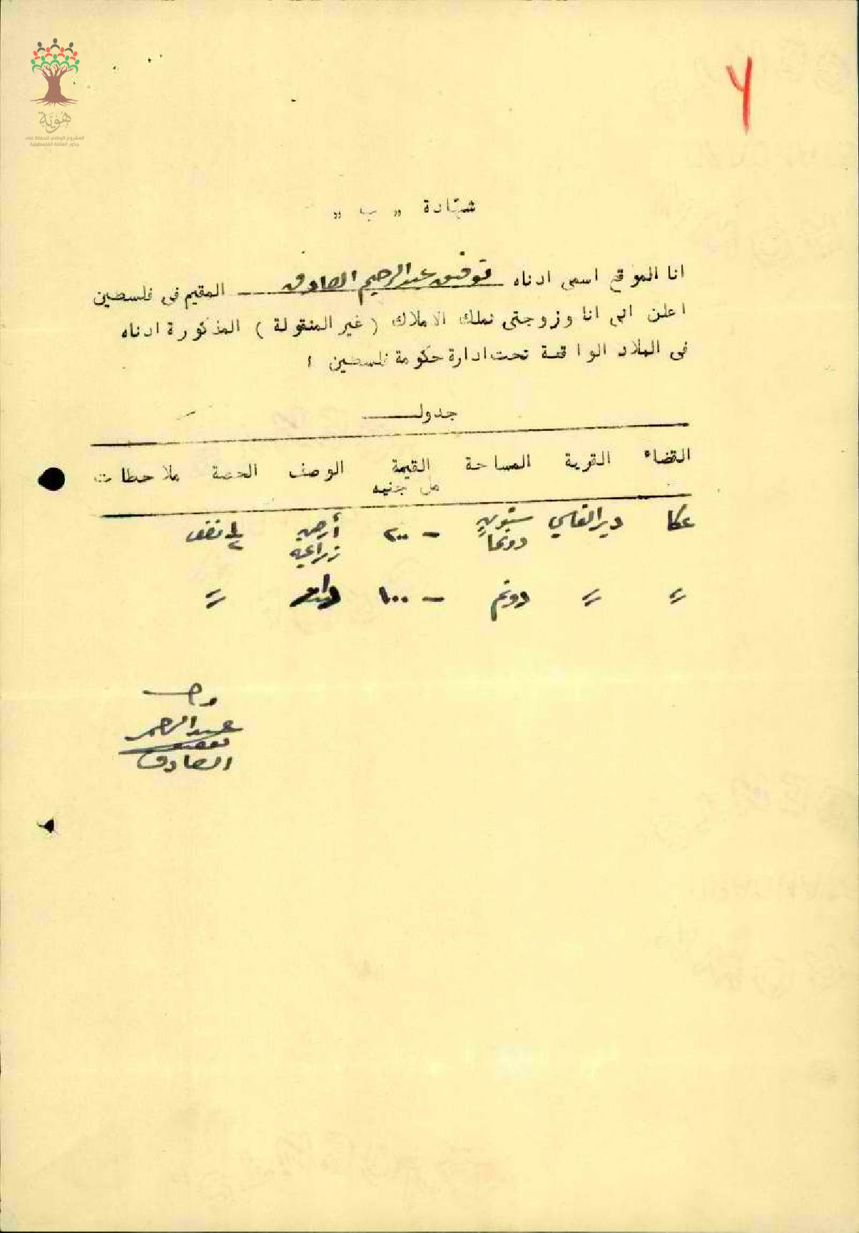 شهادة اثبات ملكية-المعلم توفيق عبد الرحيم صادق/دير القاسي