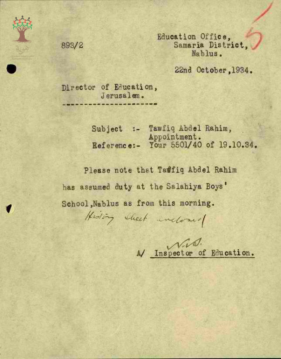 رسالة من مفتش المعارف الى مدير المعارف يخبره بأن المعلم توفيق صادق قد باشر عمله في مدرسة الصلاحية