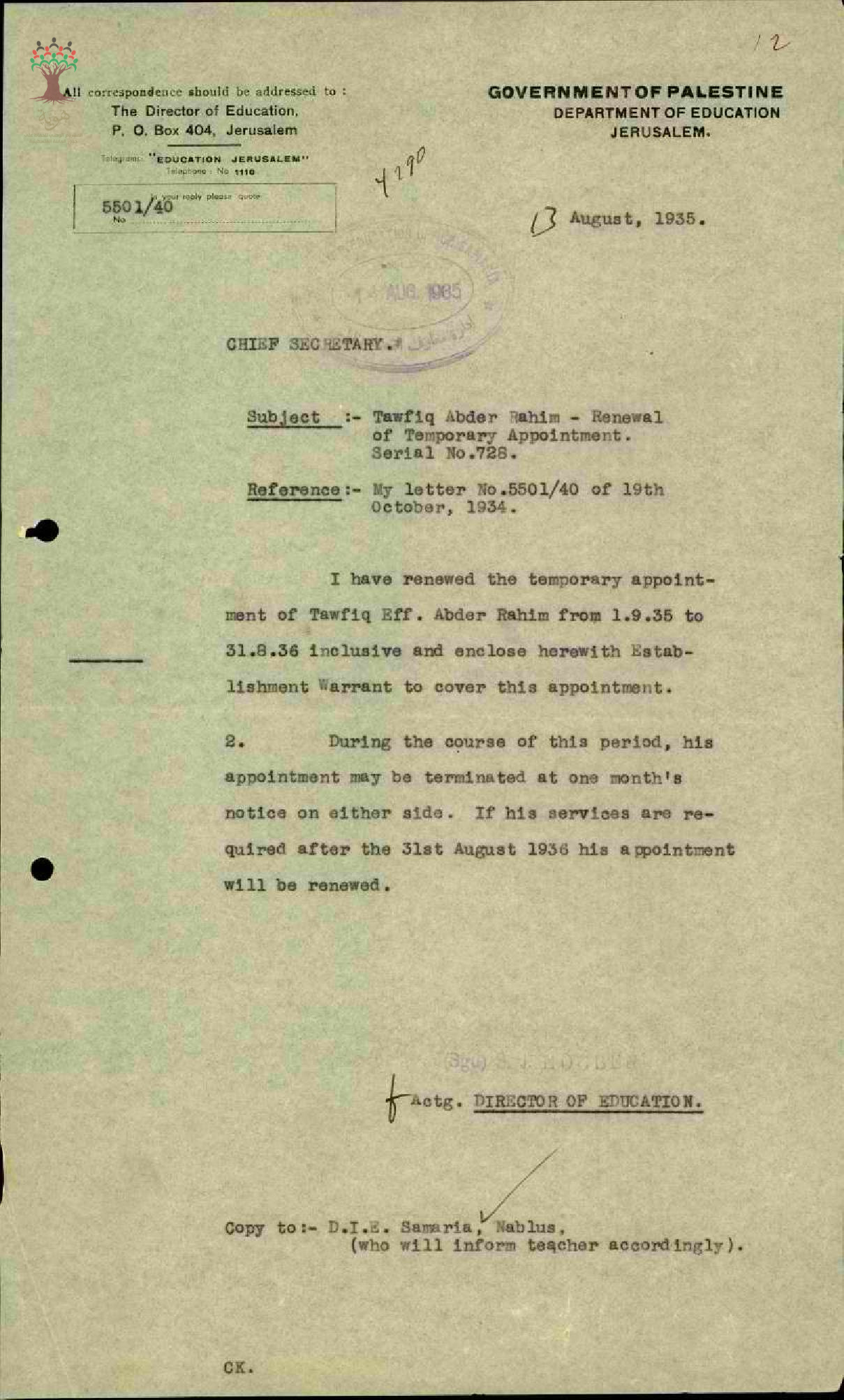 رسالة من مدير المعارف الى رئيس السكرتارية بخصوص إعادة تعيين المعلم توفيق عبد الرحيم صادق في مدرسة الصلاحية