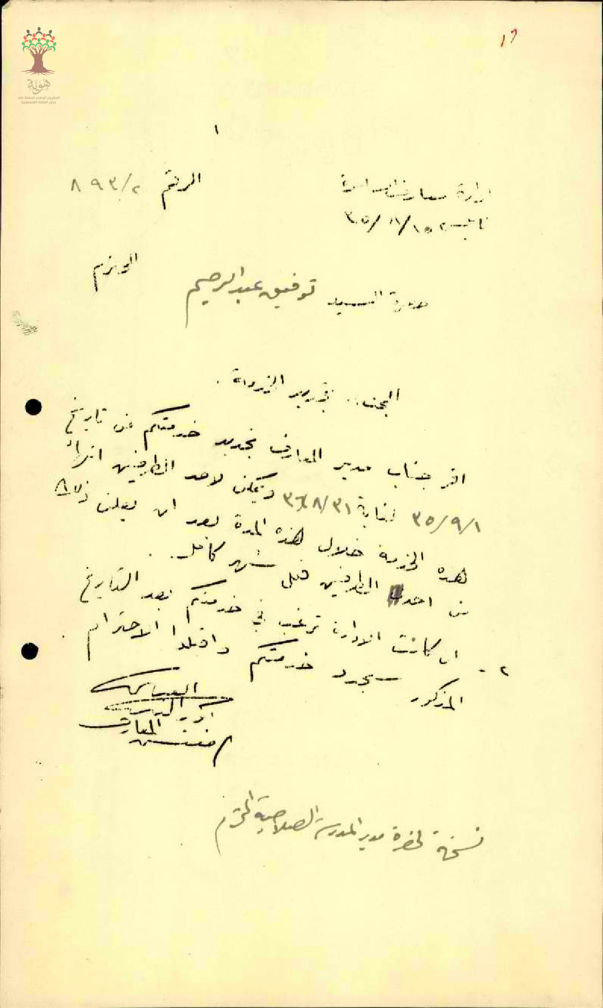 رسالة من مفتش المعارف الى المعلم توفيق صادق بخصوص تجديد خدمته