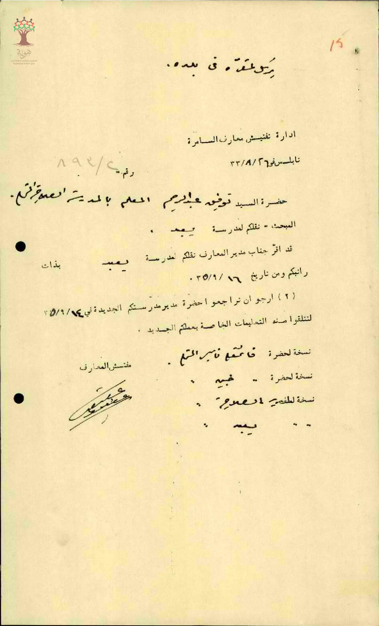 نقل المعلم توفيق عبد الرحيم صادق من مدرسة الصلاحية الى مدرسة يعبد