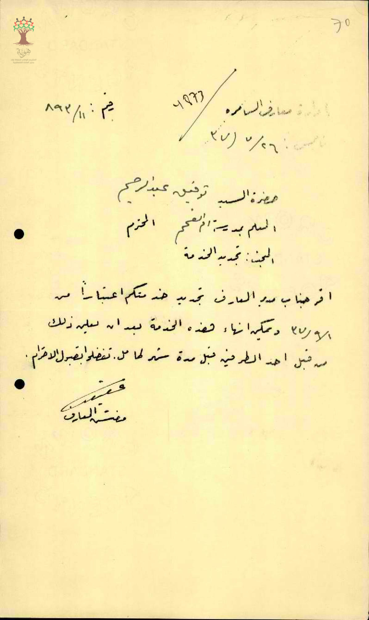 رسالة من مفتش المعارف الى المعلم توفيق صادق بخصوص تجديد خدمته