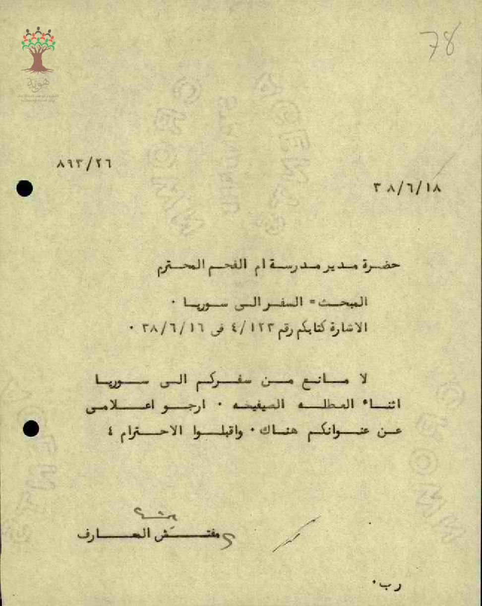 رسالة من مفتش المعارف الى المعلم توفيق صادق يسمح له بالسفر الى سوريا في عطلة الصيف