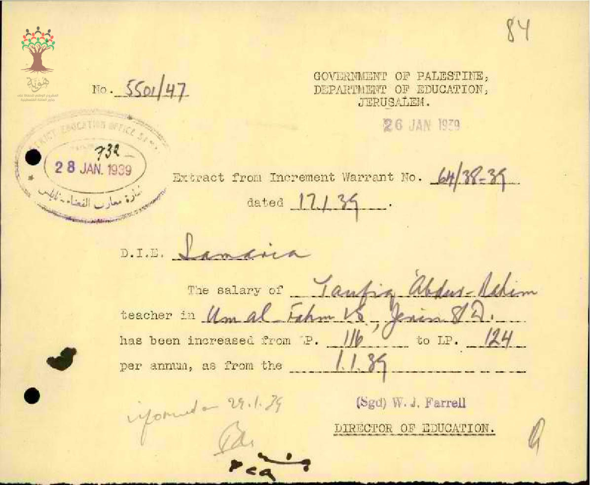 رسالة من مدير المعارف الى مفتش المعارف بخصوص زيادة راتب المعلم توفيق صادق السنوية
