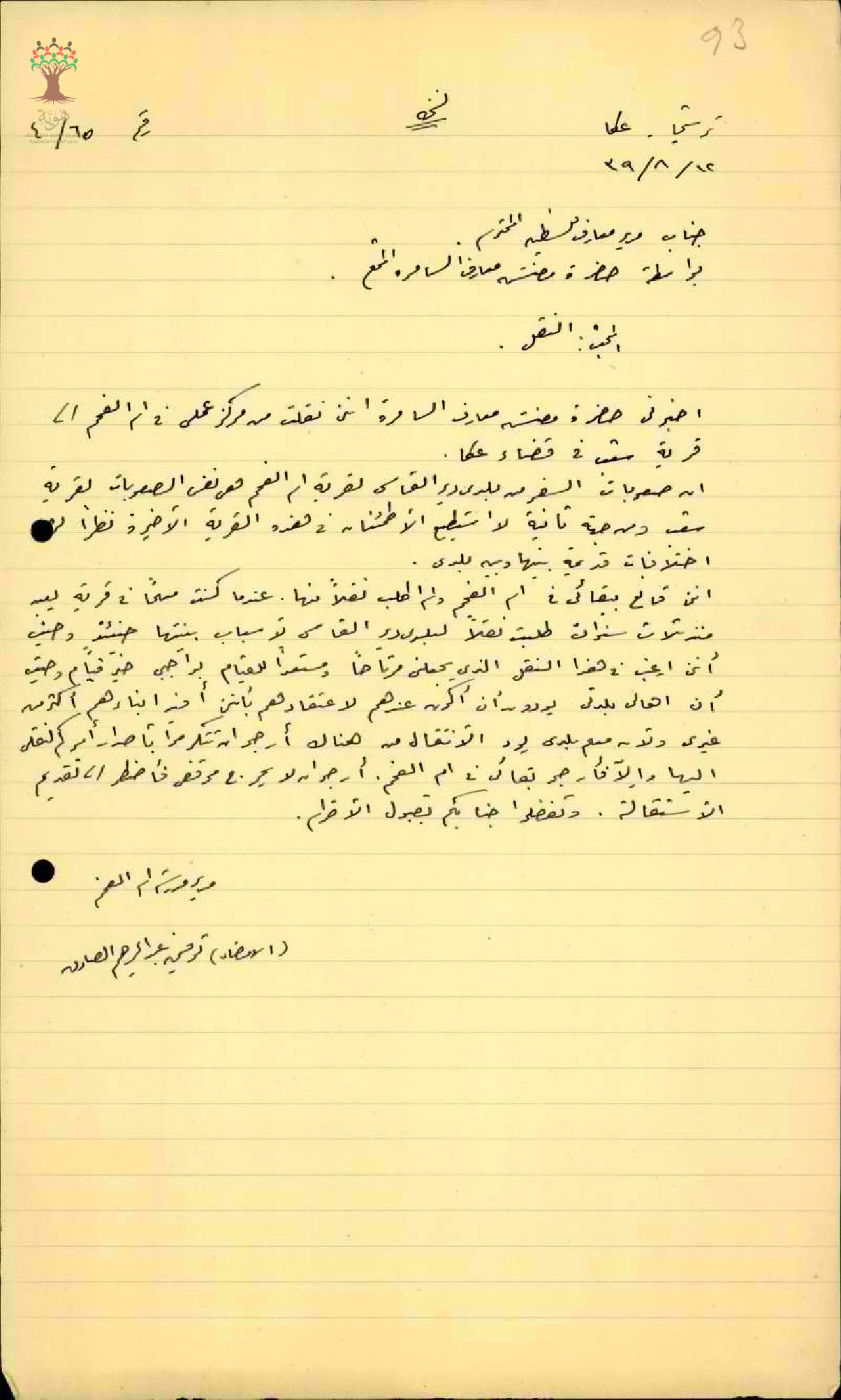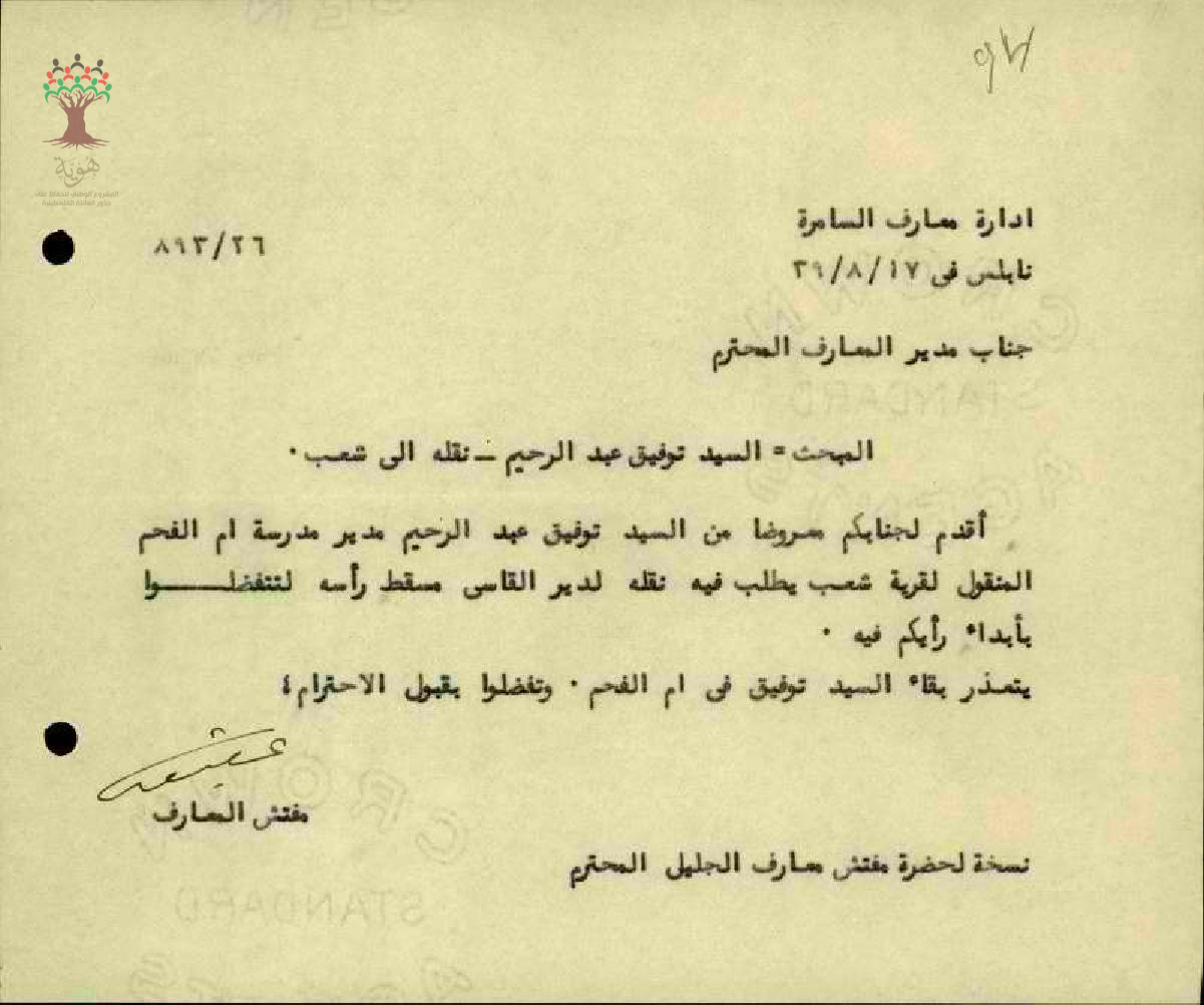 رسالة من مفتش المعارف الى مدير المعارف مرفقة برسالة من المعلم توفيق صادق يطلب فيها عدم نقله الى شعب بل الى دير القاسي