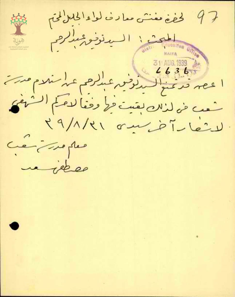 رسالة من المعلم مصطفى سعد الى مفتش المعارف يخبره بأن المعلم توفيق صادق لم يستلم عمله في مدرسة شعب