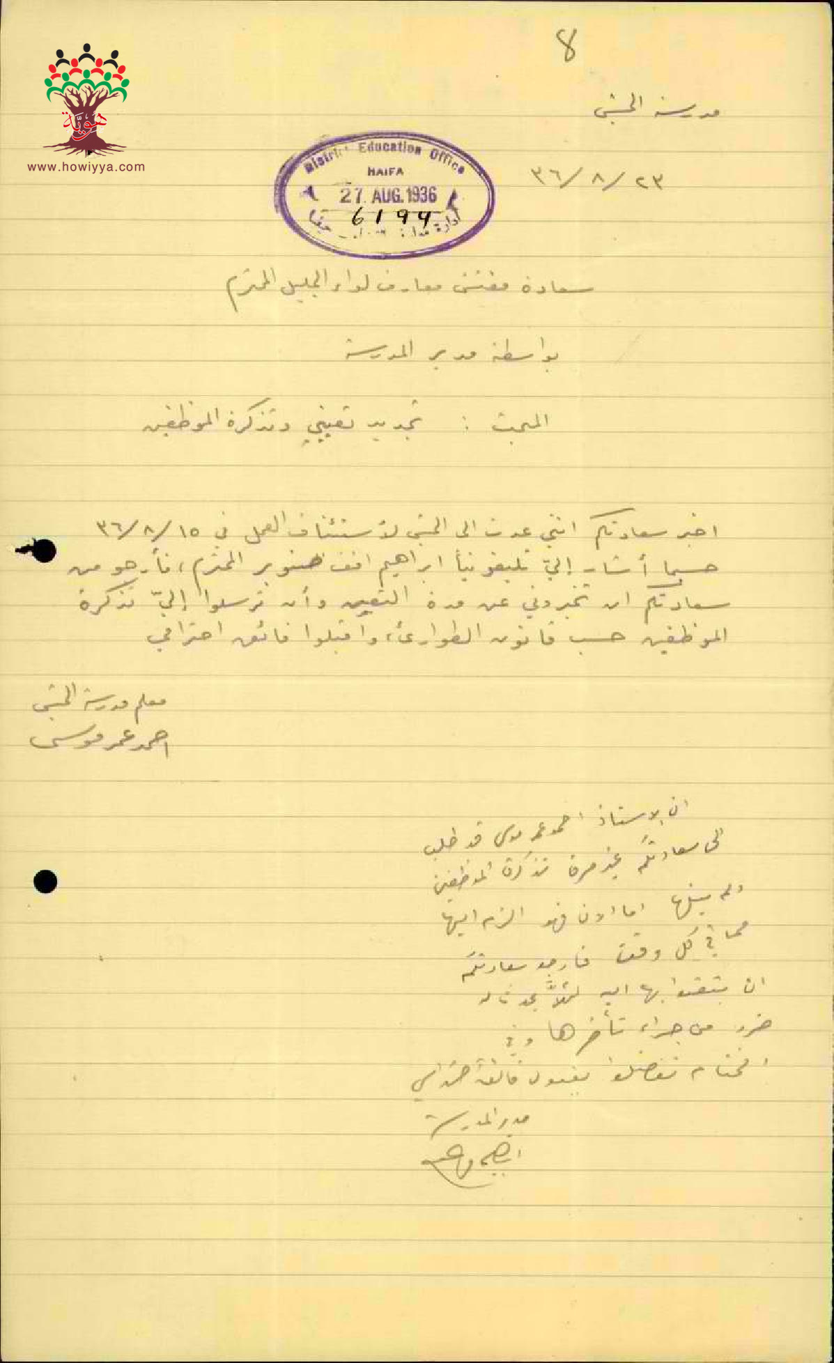 رسالة من مدير مدرسة الجش للمعلم احمد موسى عن اعادة تعيينه معلماً - صفد