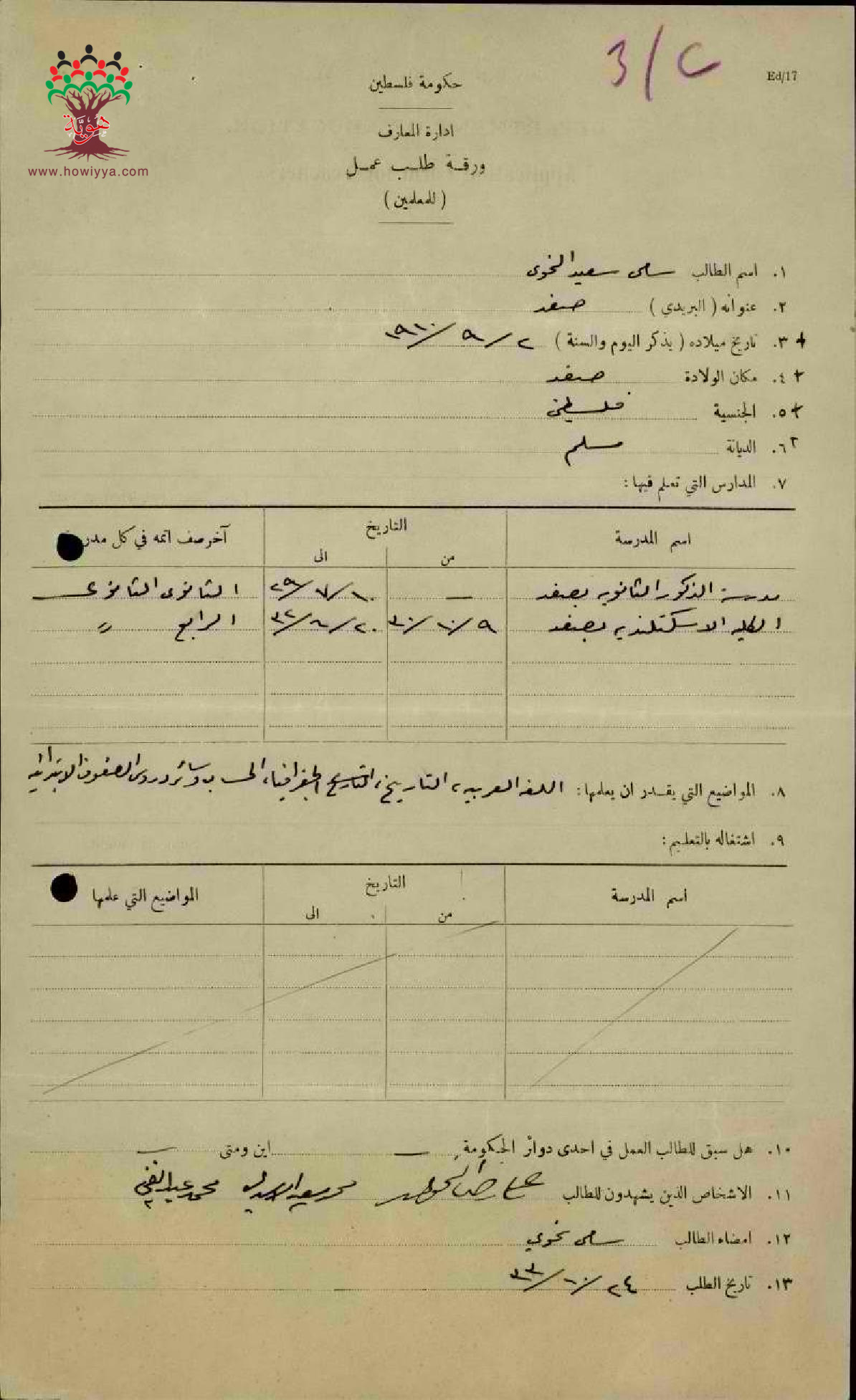 طلب عمل مقدم من قبل المعلم سامي سعيد النحوي - صفد - مدرسة بيسان