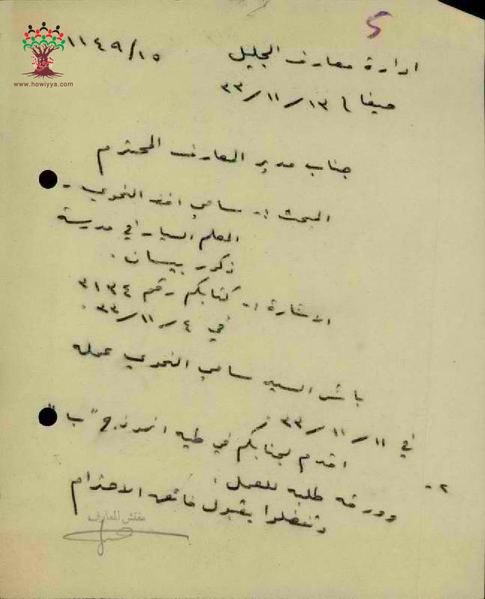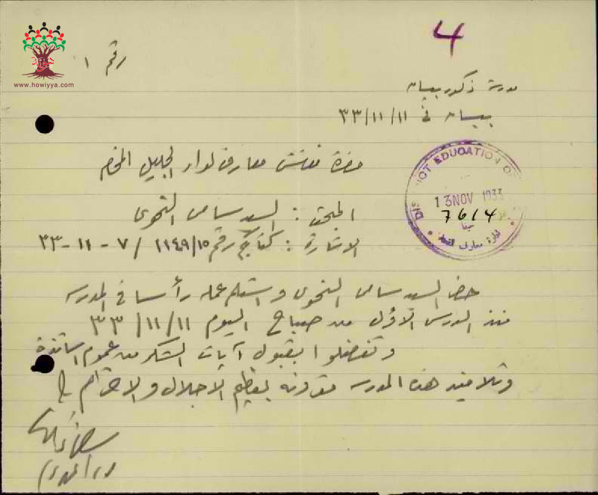رسائل من مدير مدرسة بيسان و المفتش عن استلام المعلم سامي النحوي العمل - صفد