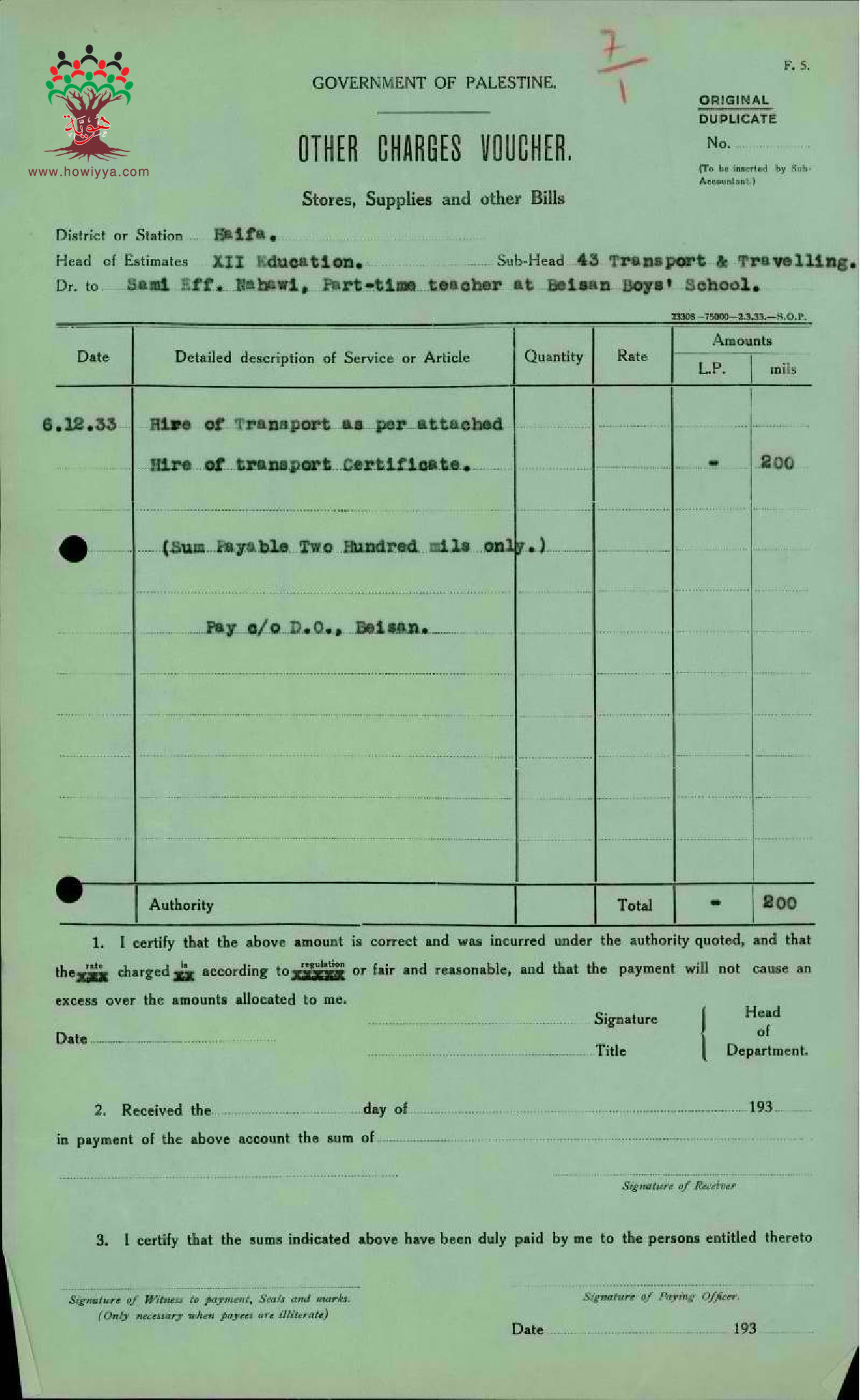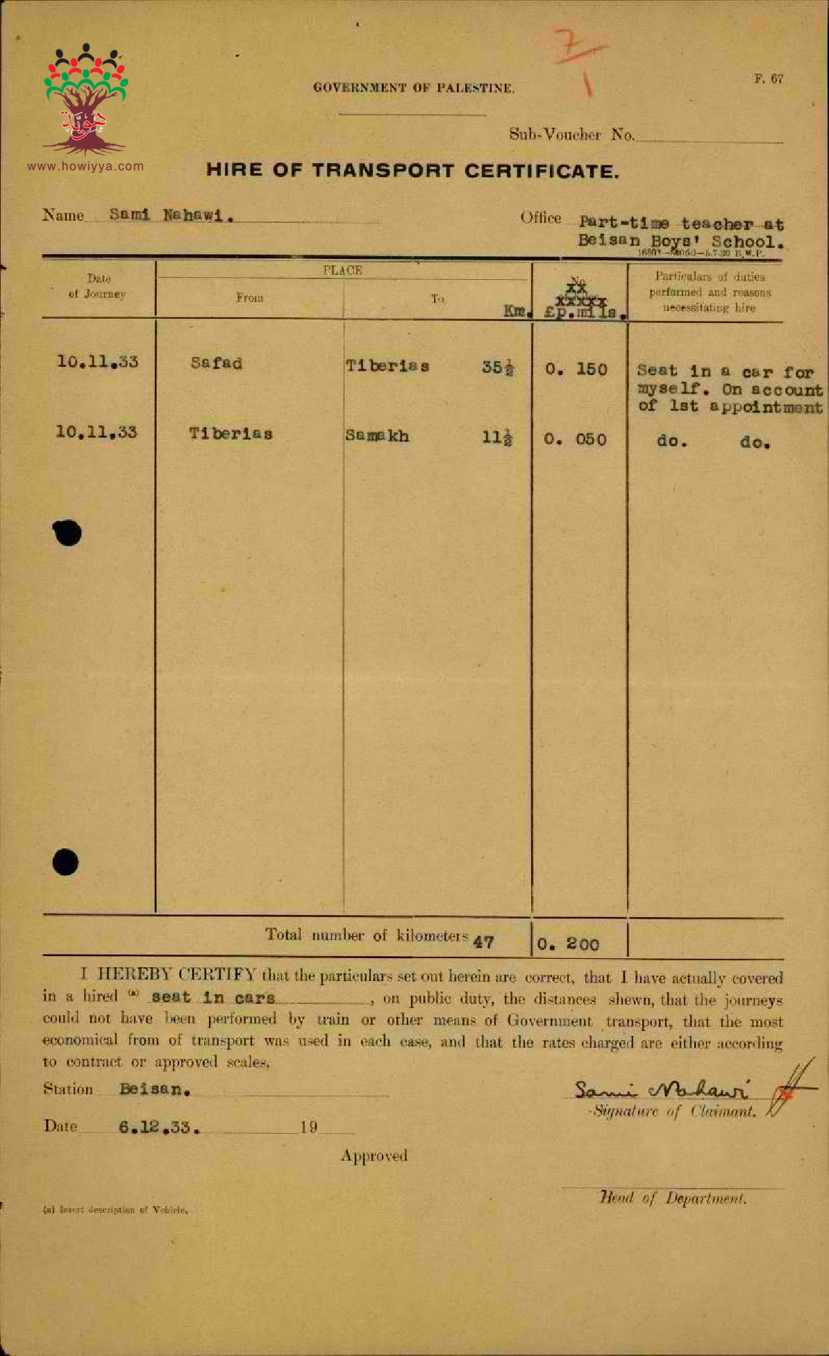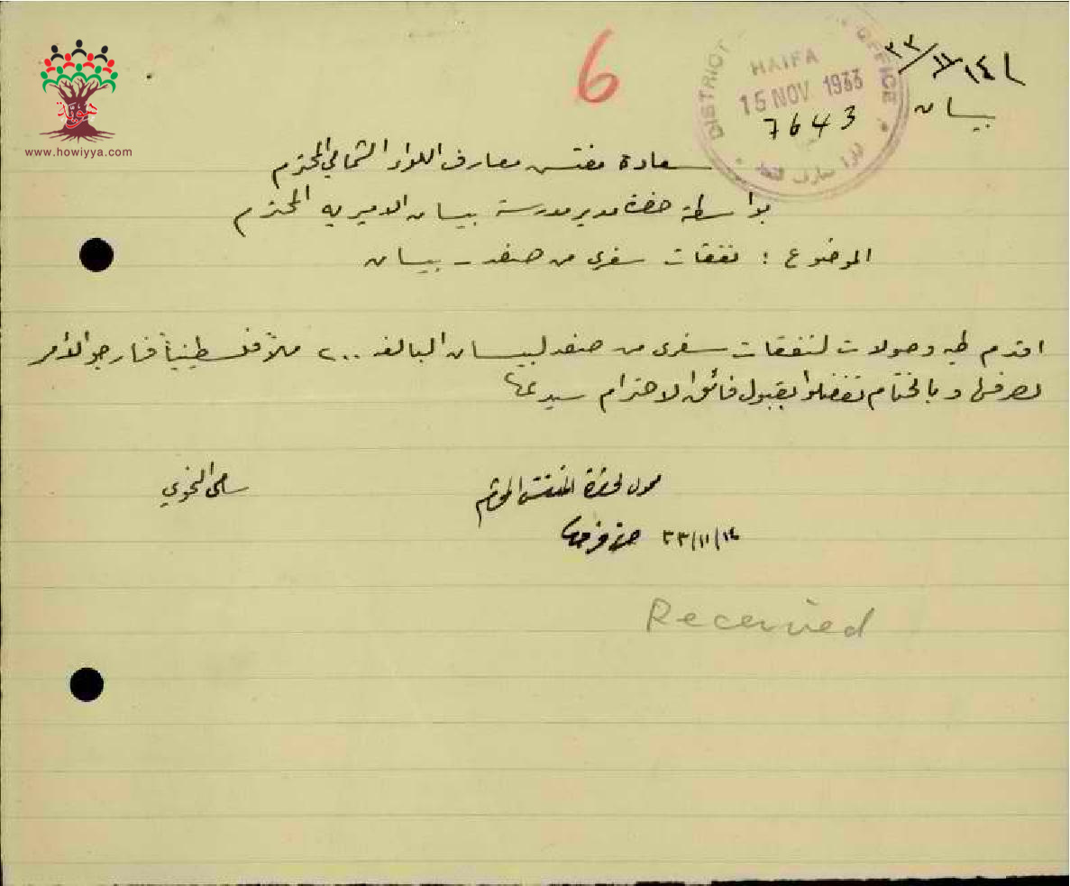 نفقات السفر من صفد الى بيسان مقدمة من قبل المعلم سامي النحوي - صفد
