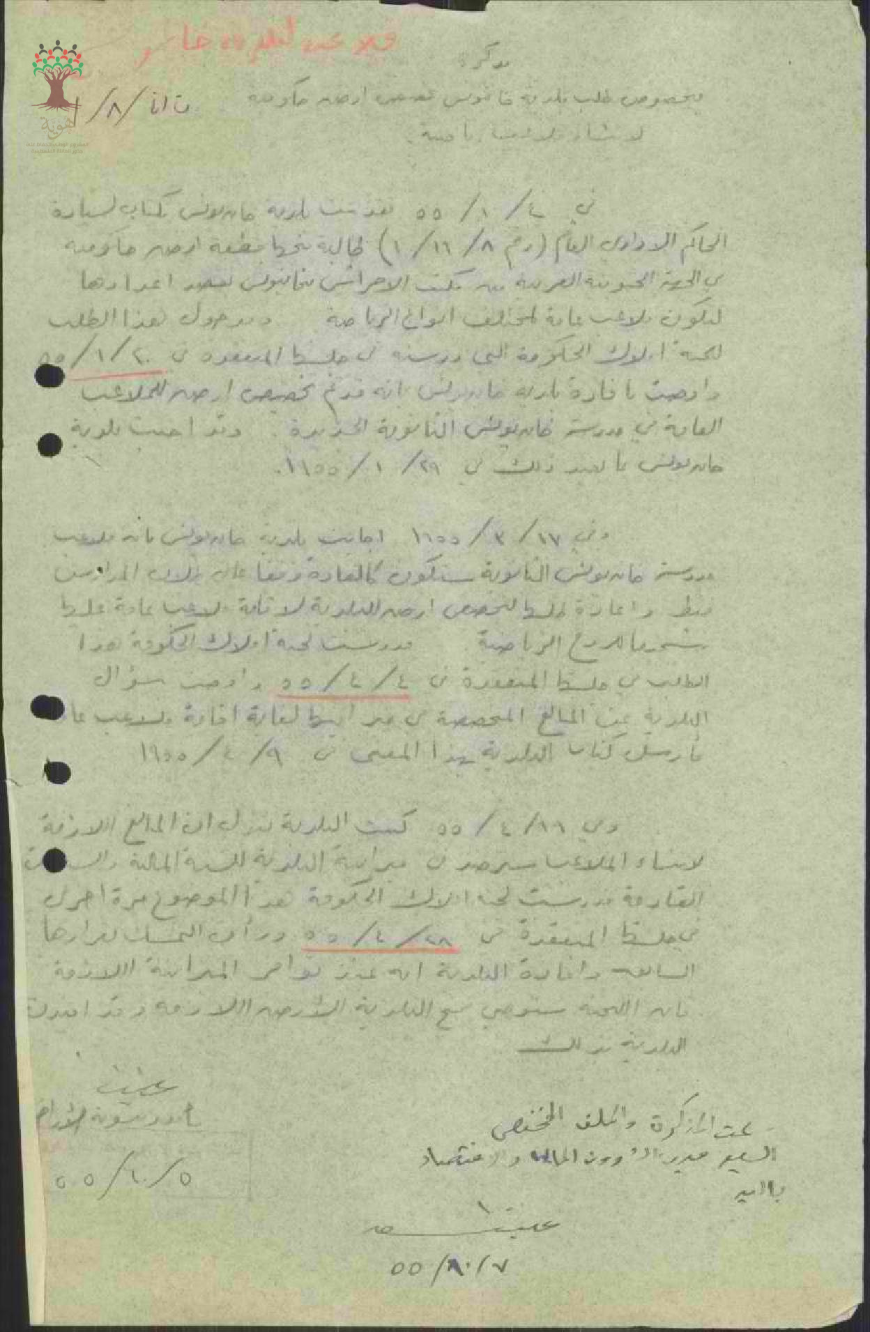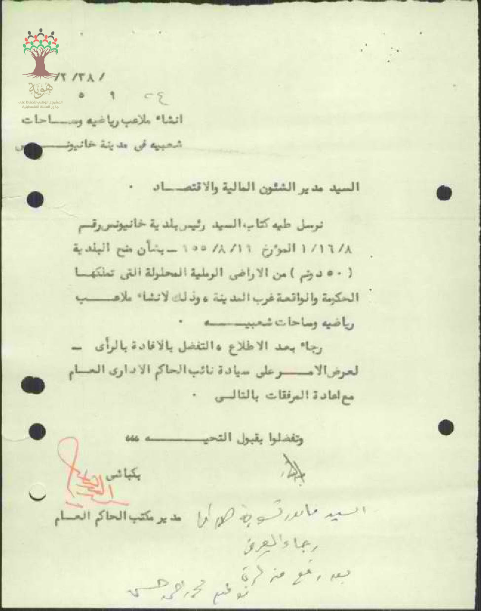 رسالة من مأمور تسوية الأراضي إلى الحاكم العام بخصوص انشاء ملاعب رياضية بخان يونس
