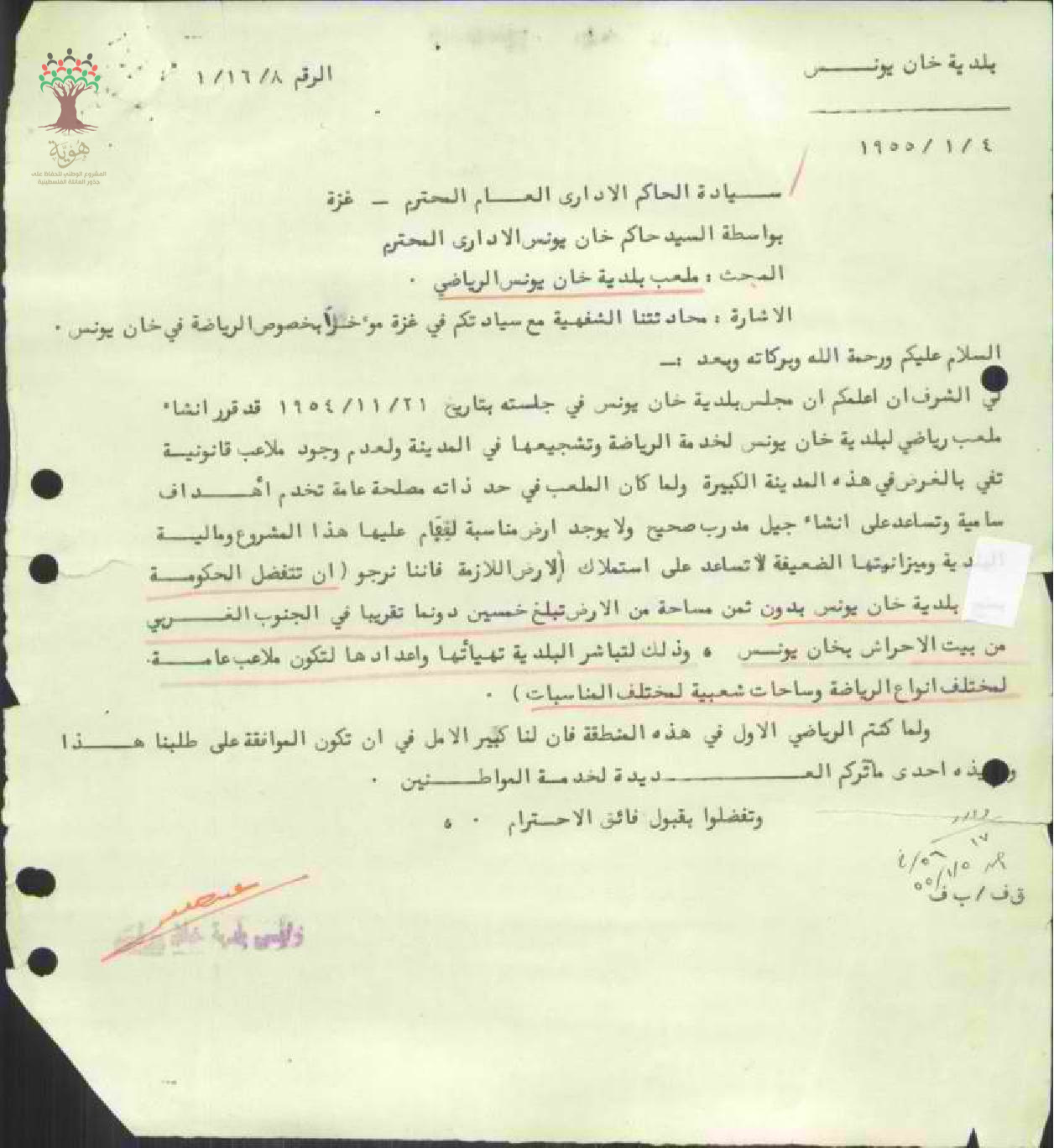 رسالة من حاكم خان يونس الإداري إلى مدير مكتب الحاكم العام بخصوص طلب تخصيص أرض من أراضي الحكومة لإنشاء ملاعب