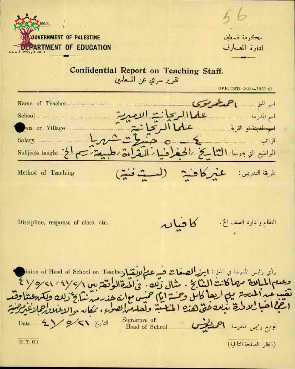 رأي مدير مدرسة علما بالمعلم احمد عمر موسى مدرسة علما - صفد