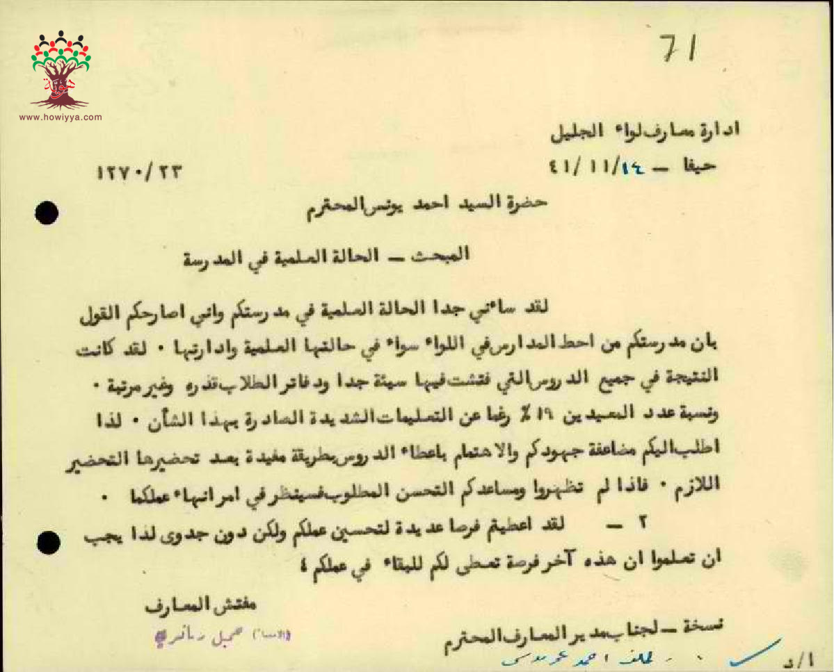 الحالة العلمية في مدرسة علما - رسالة من المفتش العام الى المعلم احمد موسى - صفد