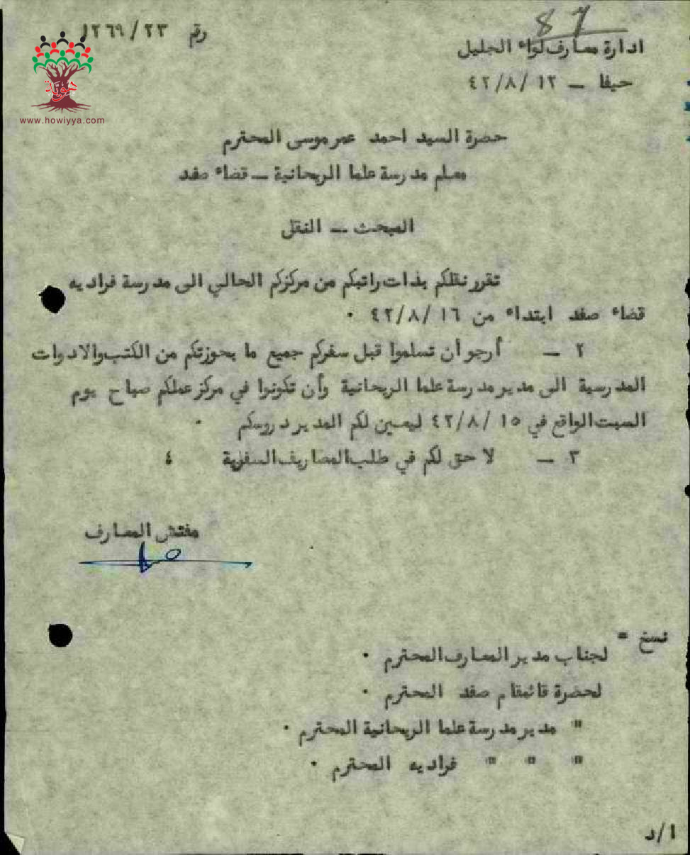 نقل المعلم احمد عمر موسى من مدرسة علما الى مدرسة فرادة - صفد