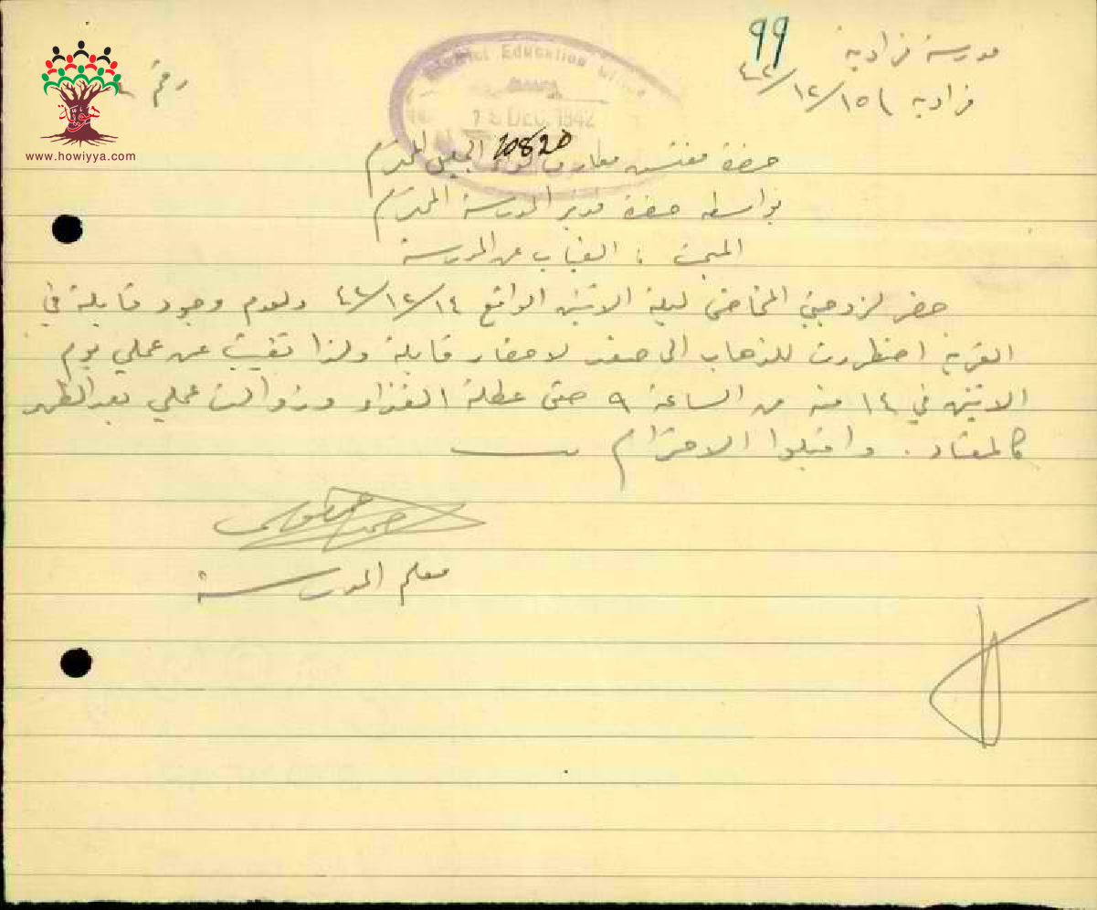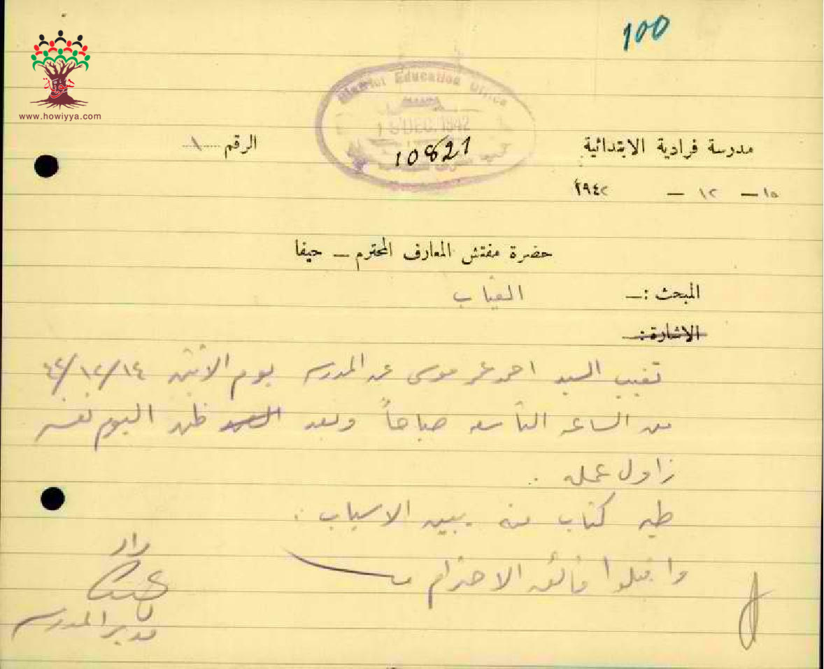 غياب المعلم احمد عمر موسى بسبب ولادة زوجته - صفد - مدرسة فرادة