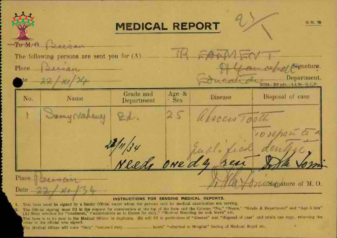 تقرير طبي مقدم من قبل المعلم سامي سعيد النحوي - صفد - مدرسة بيسان