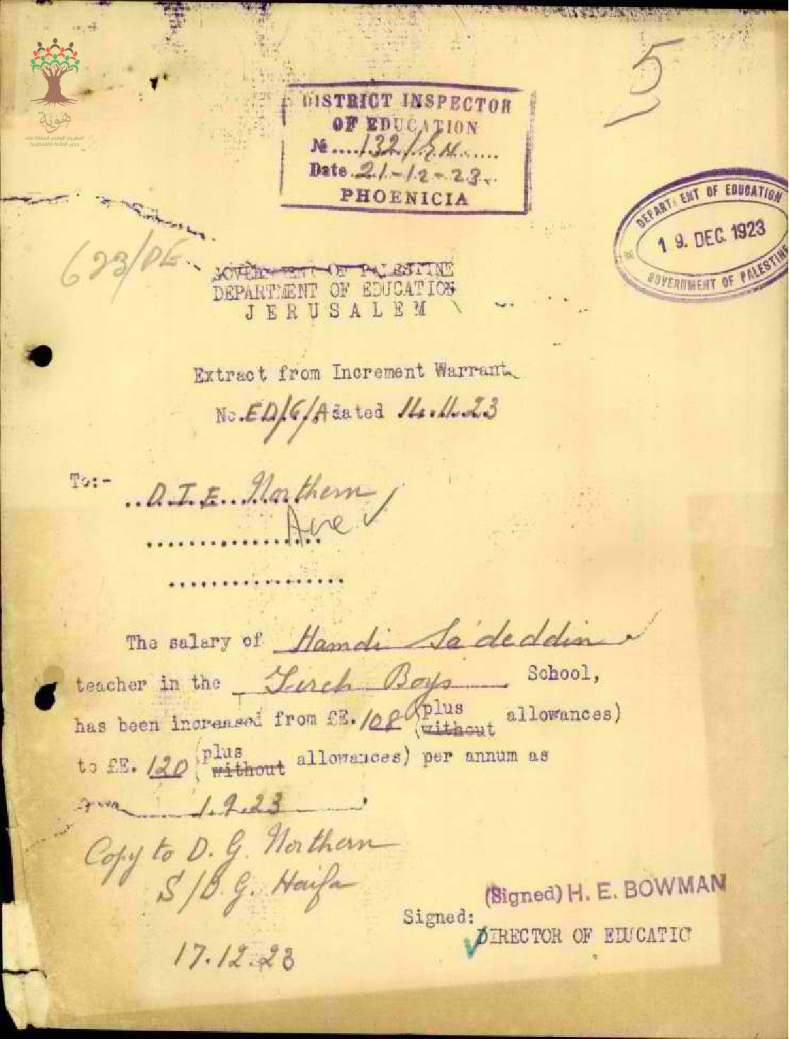 رسالة من مدير المعارف الى مفتش المعارف بخصوص زيادة راتب المعلم حمدي سعد الدين السنوية