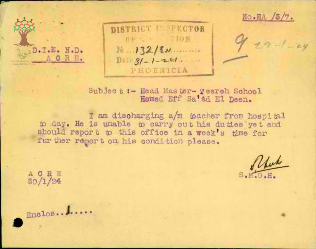 رسالة من طبيب الصحة الى مفتش المعارف بخصوص خروج المعلم حمدي سعد الدين من المستشفى