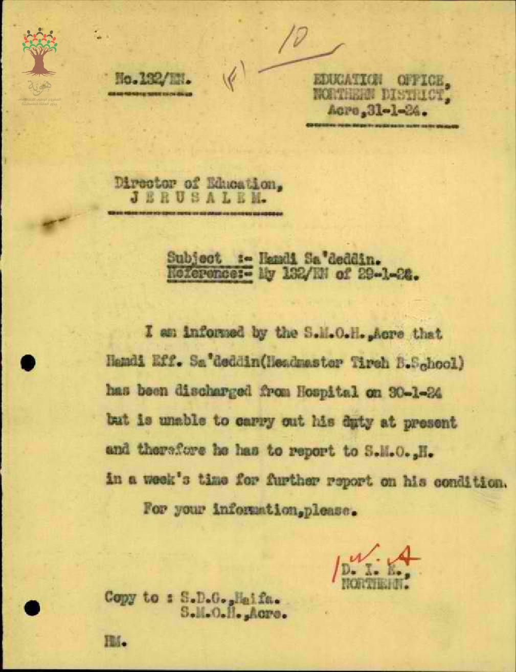 رسالة من مفتش المعارف الى مدير المعارف بخصوص خروج المعلم حمدي سعد الدين من المستشفى