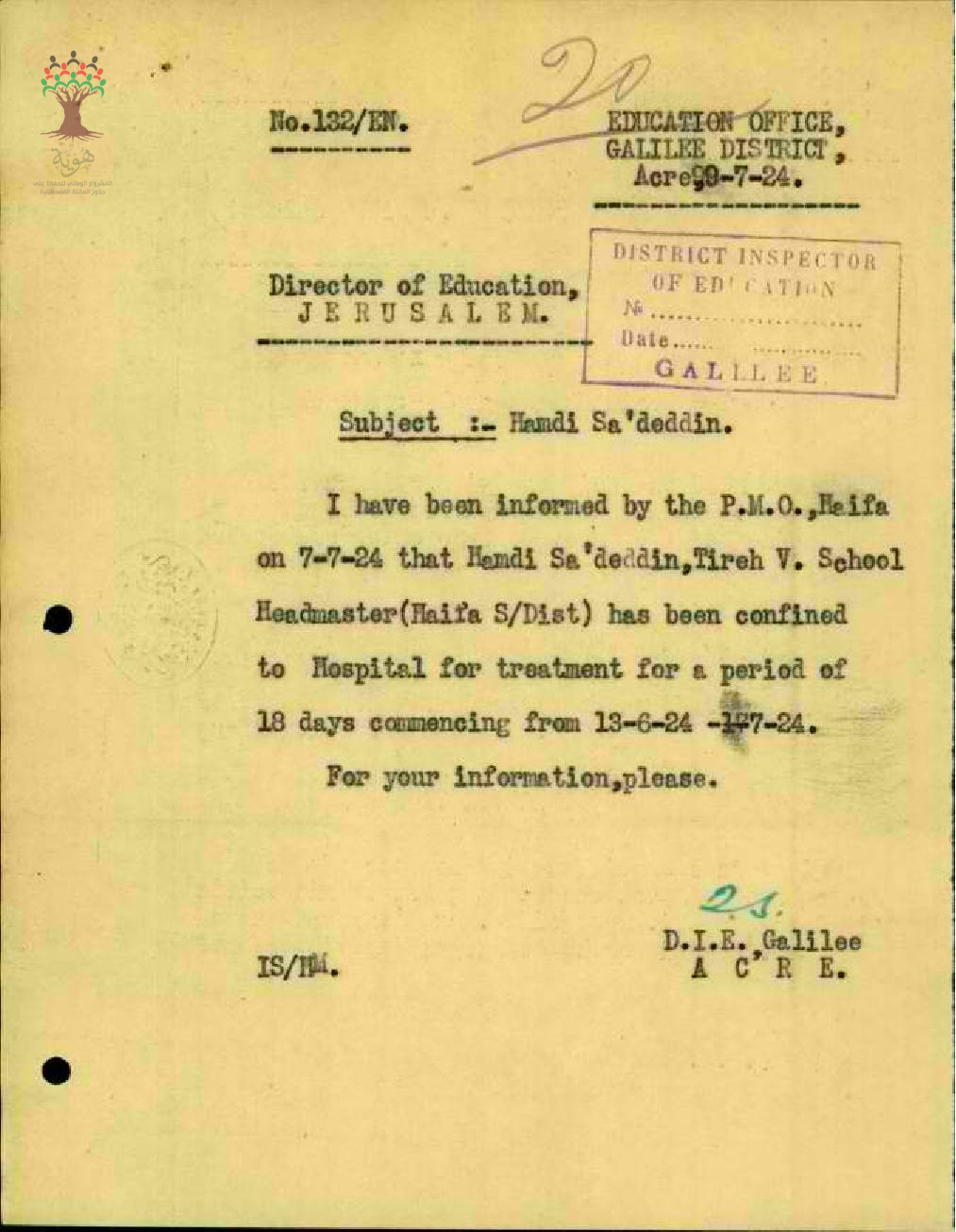 رسالة من مفتش المعارف الى مدير المعارف بخصوص تمديد الاجازة المرضية للمعلم حمدي سعد الدين لمدة 18 يوما