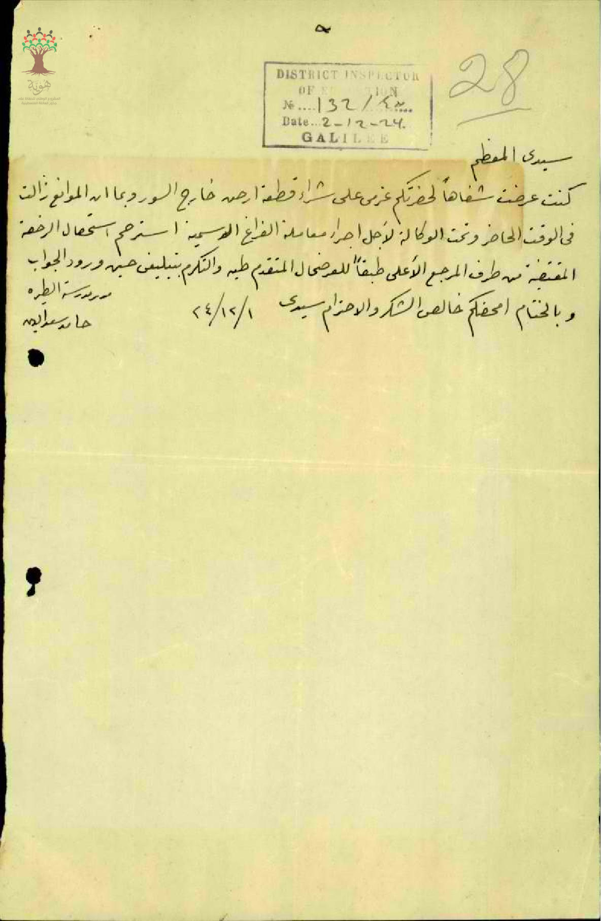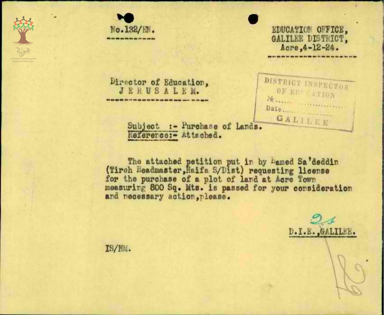 رسالة من مفتش المعارف الى مدير المعارف مرفقة برسالة من المعلم حمدي سعد الدين يطلب فيها الاذن لشراء قطعة أرض