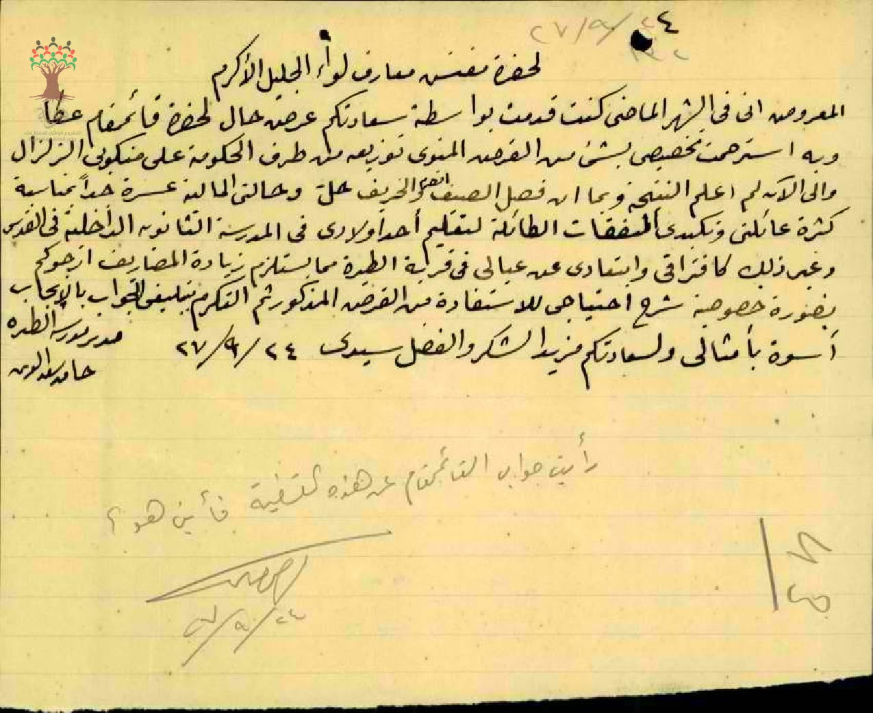 رسالة من المعلم حمدي سعد الدين الى مفتش المعارف يسأل عن طلبه لمساعدته في اعادة بناء منزله