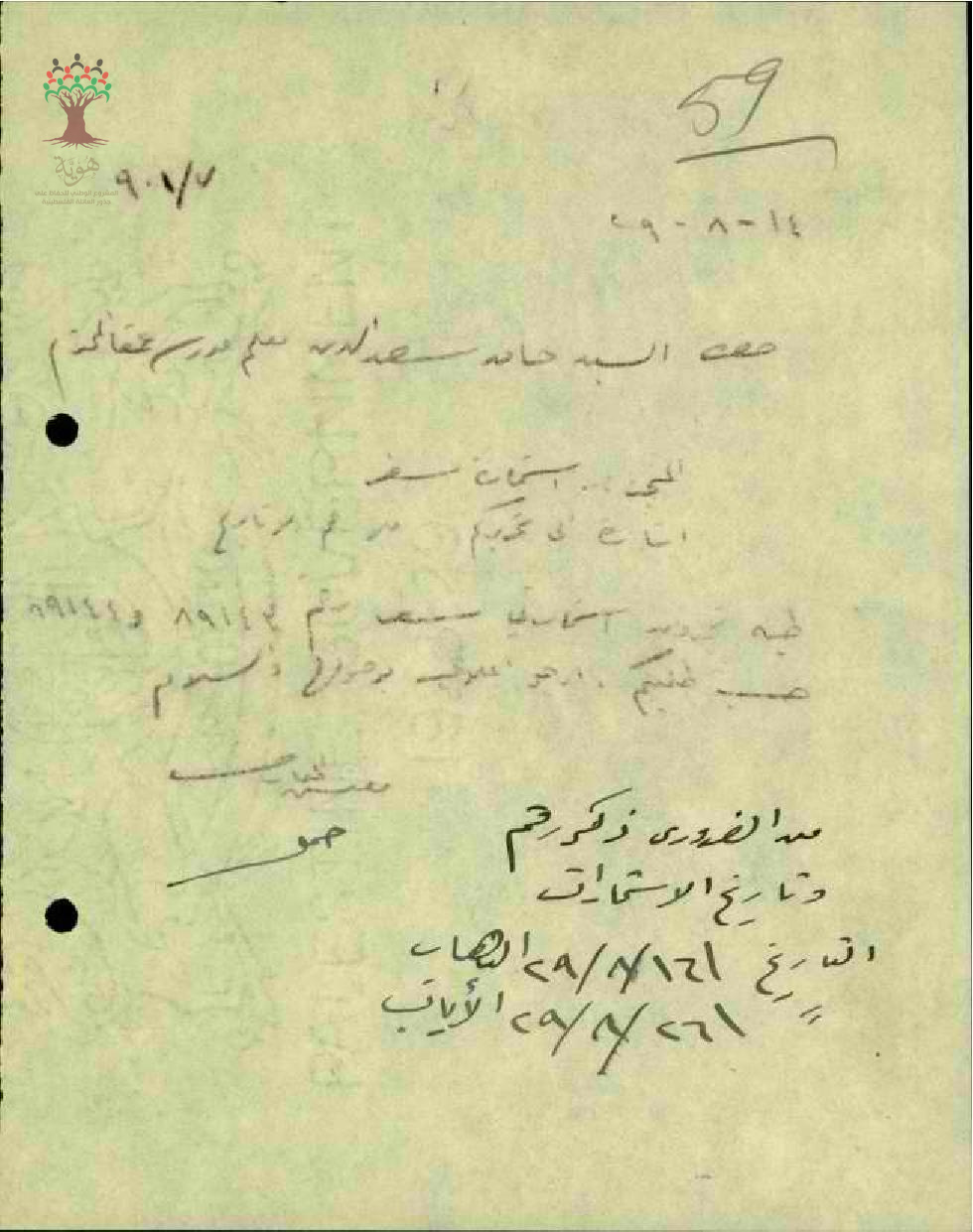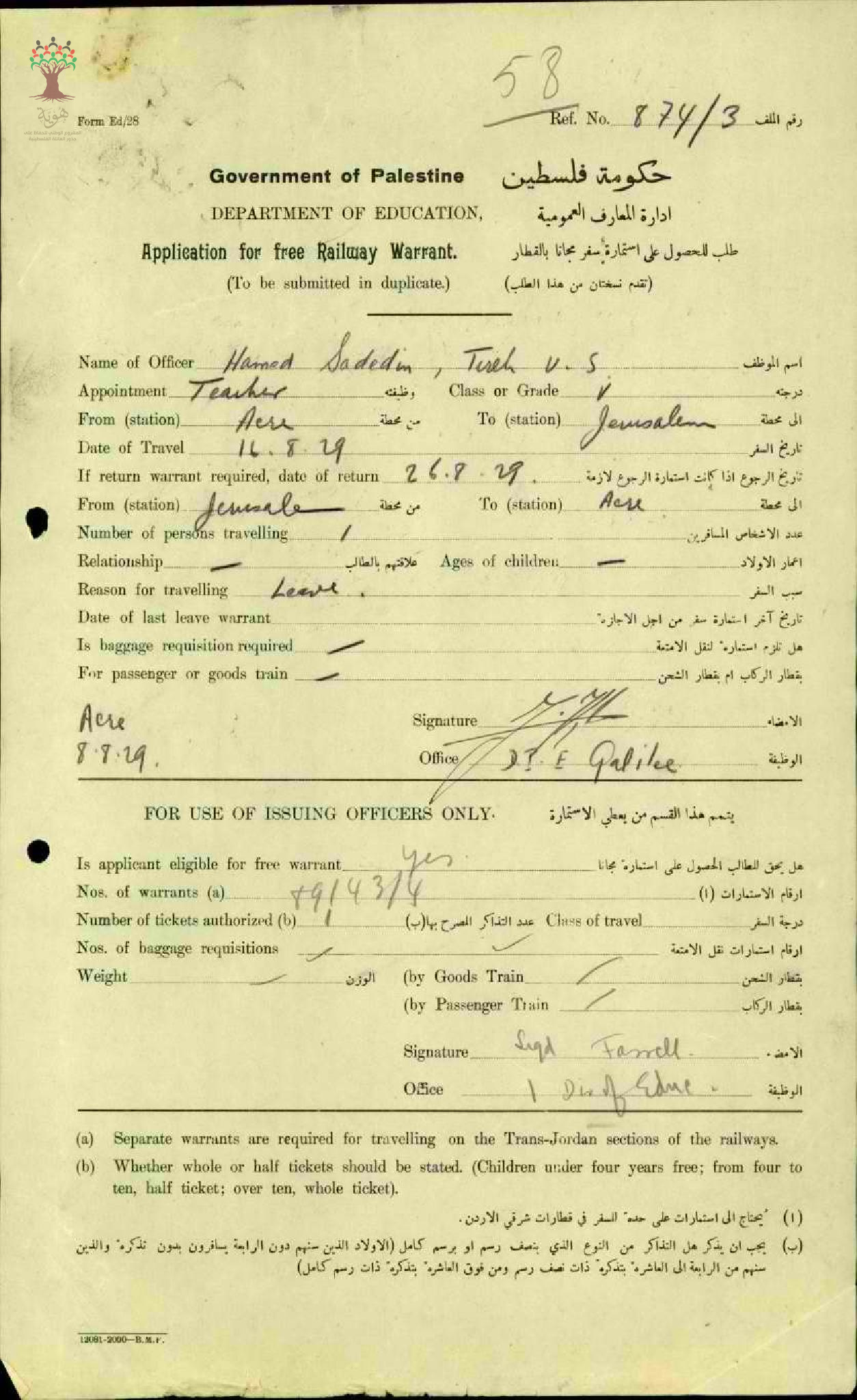 رسالة من مفتش المعارف الى المعلم حمدي سعد الدين مرفقة باستمارة سفره