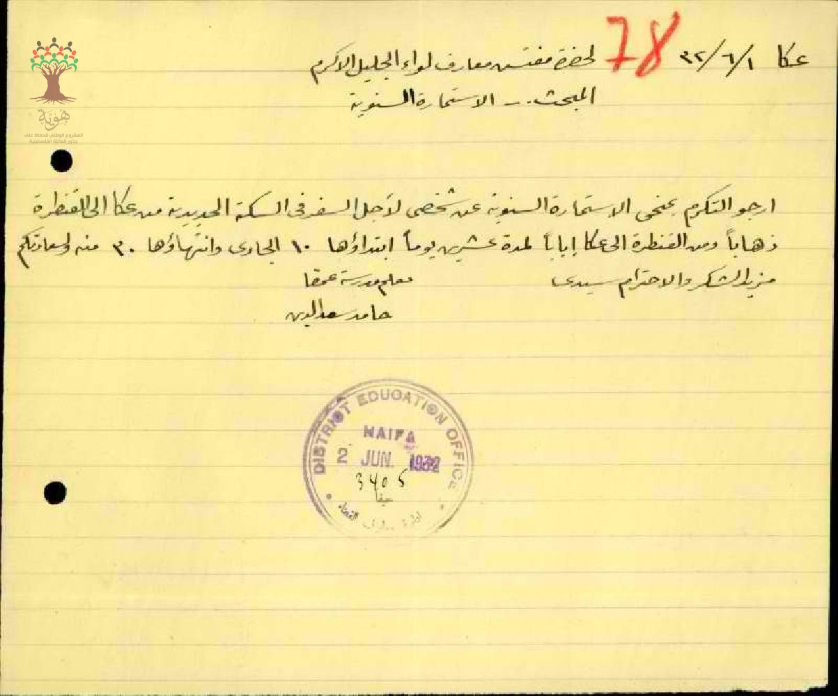 رسالة من المعلم حمدي سعد الدين الى مفتش المعارف يطلب فيها استمارة سفره السنوية