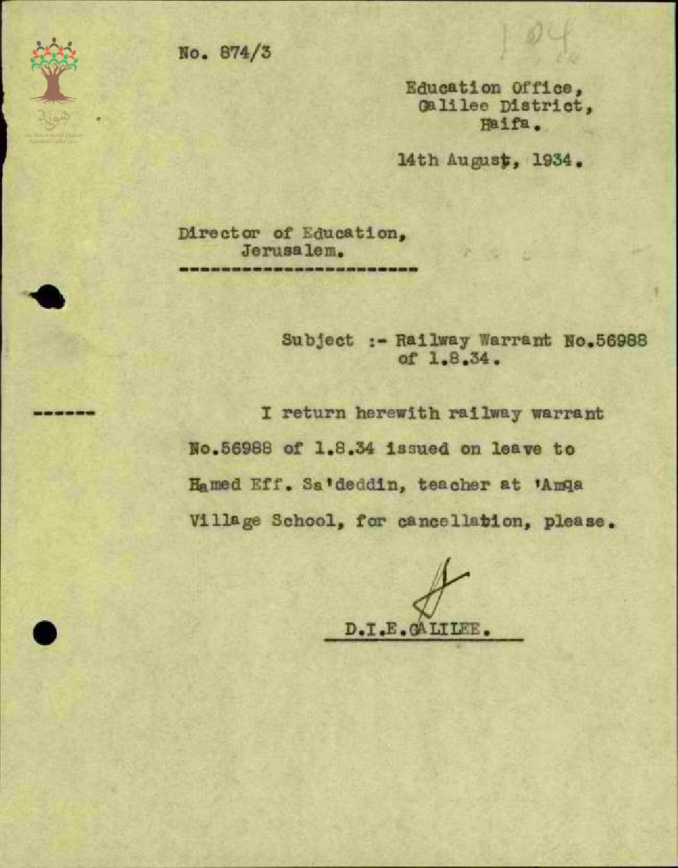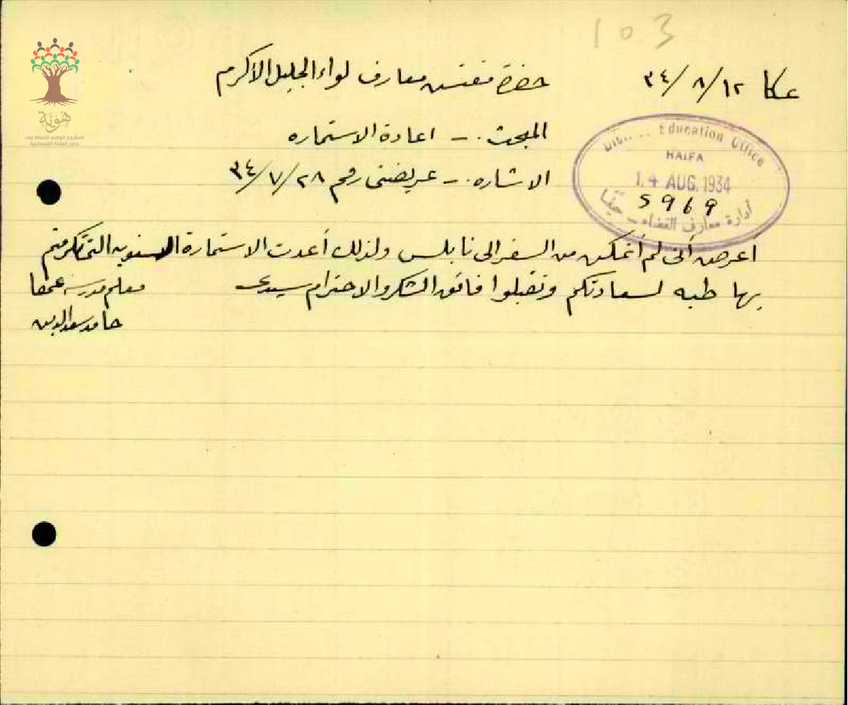 رسائل بخصوص اعادة استمارة سفر المعلم حمدي سعد الدين لأنه لم يستخدمها