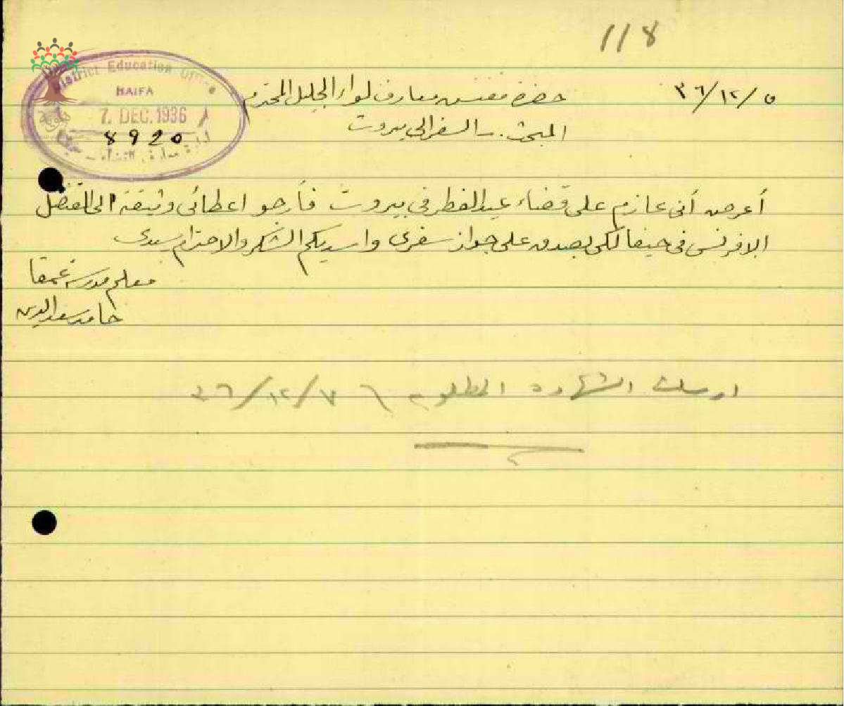 رسالة من المعلم حمدي سعد الدين الى مفتش المعارف يطلب الاذن بالسفر الى بيروت في عطلة عيد الفطر