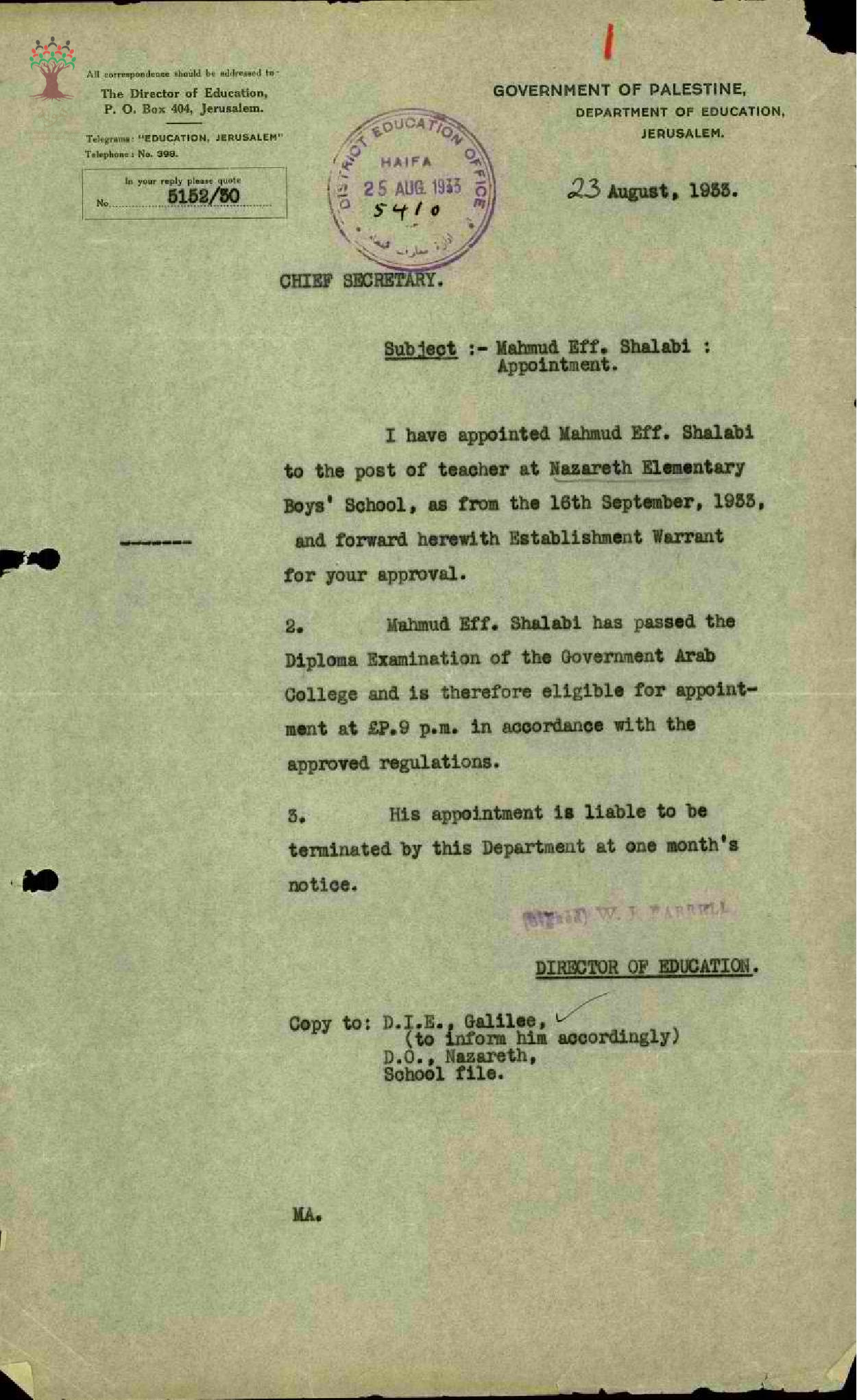 رسالة من مدير المعارف الى رئيس السكرتارية بخصوص تعيين المعلم محمود شلبي في مدرسة الناصرة
