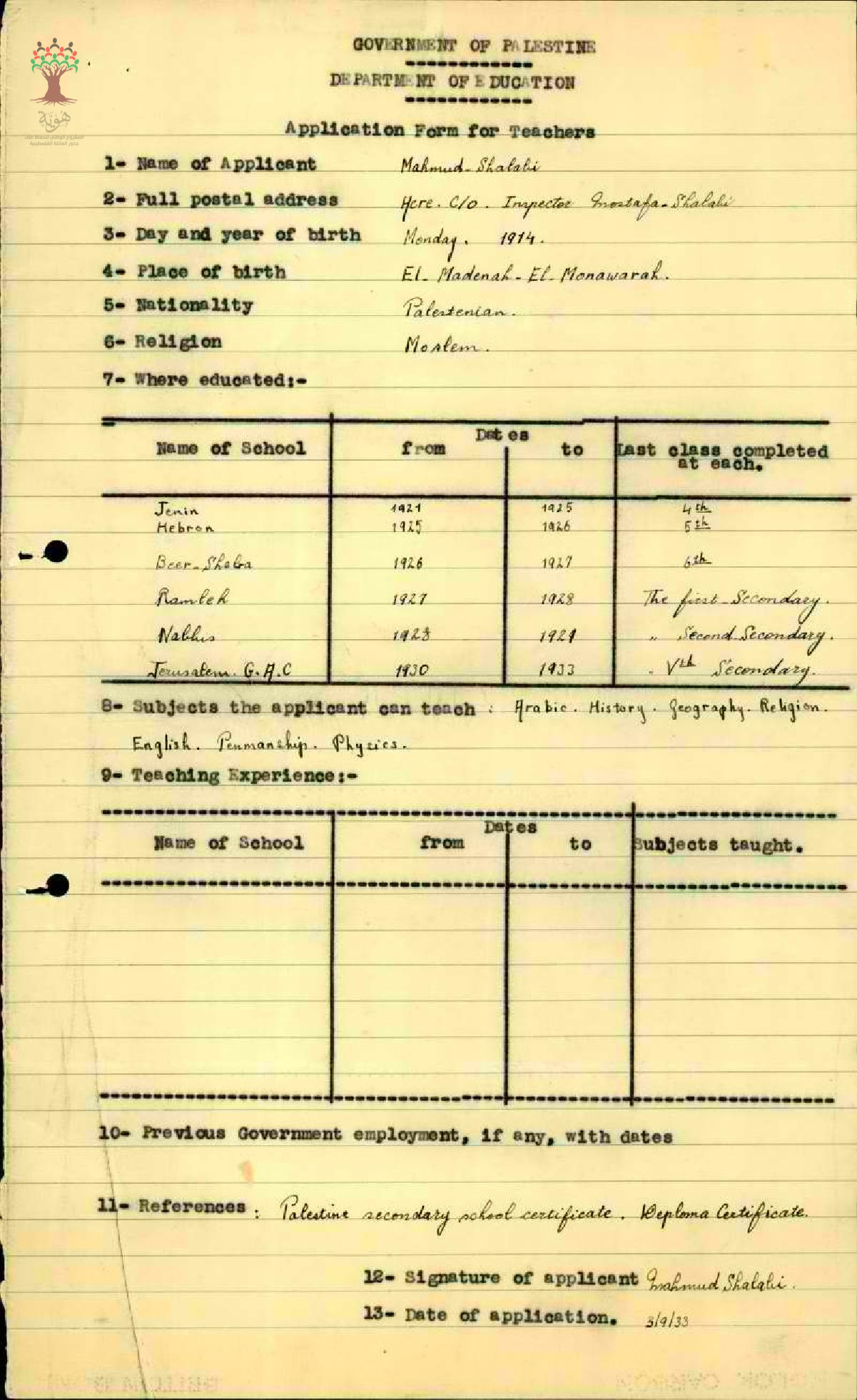ورقة تعيين المعلم محمود شلبي في مدرسة الناصرة الابتدائية