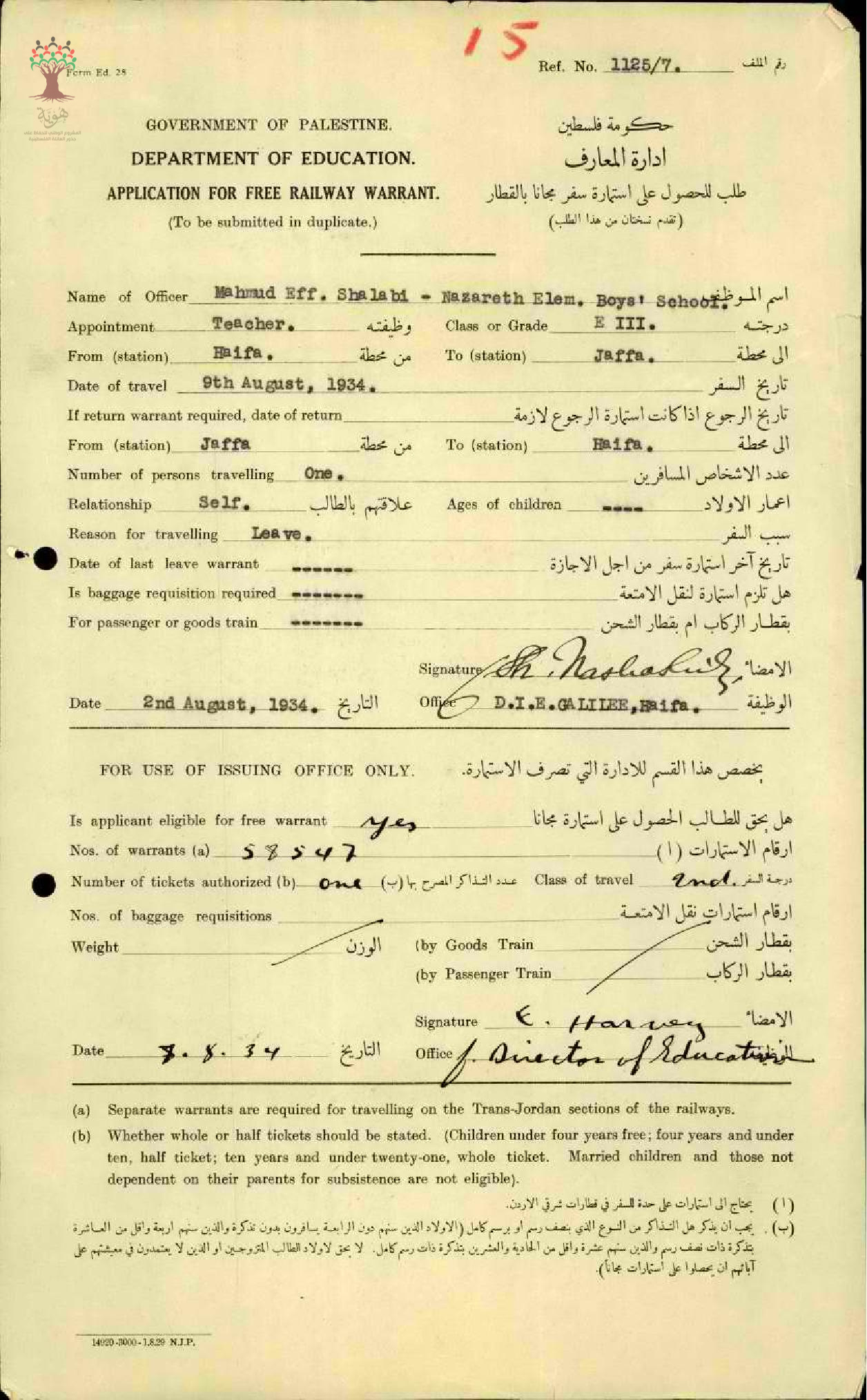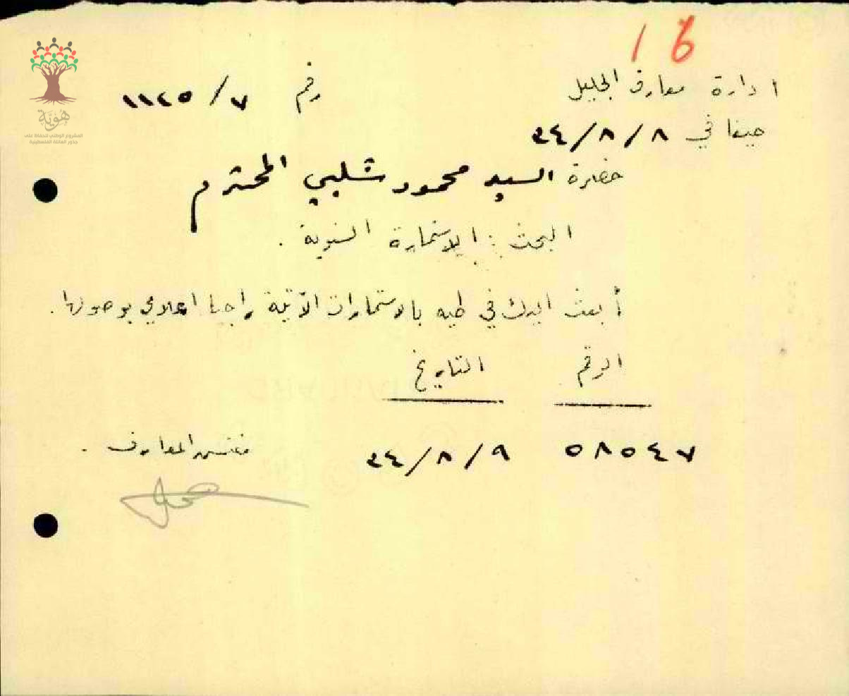 رسالة من مفتش المعارف الى المعلم محمود شلبي مرفقة باستمارة سفره السنوية