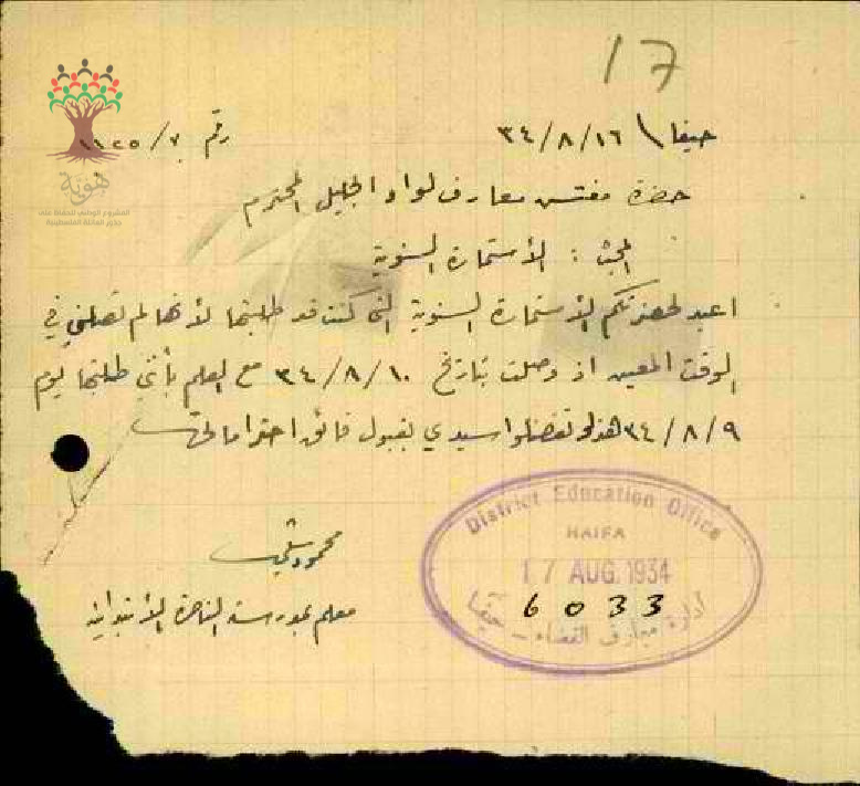 رسالة من المعلم محمود شلبي الى مفتش المعارف يخبره بأنه لم يستخدم استمارة سفره لأنها لم تصل في الوقت المعين