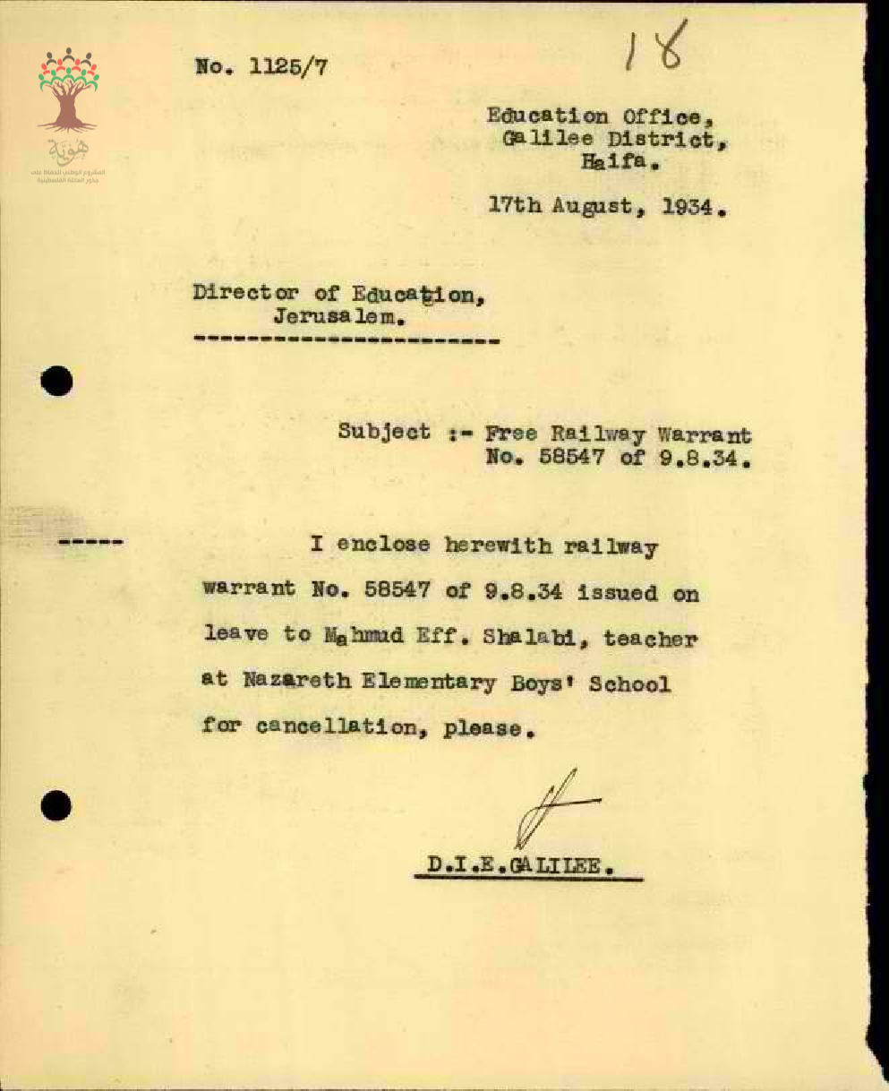 رسالة من مفتش المعارف الى مدير المعارف بخصوص اعادة استمارة سفر المعلم محمود شلبي