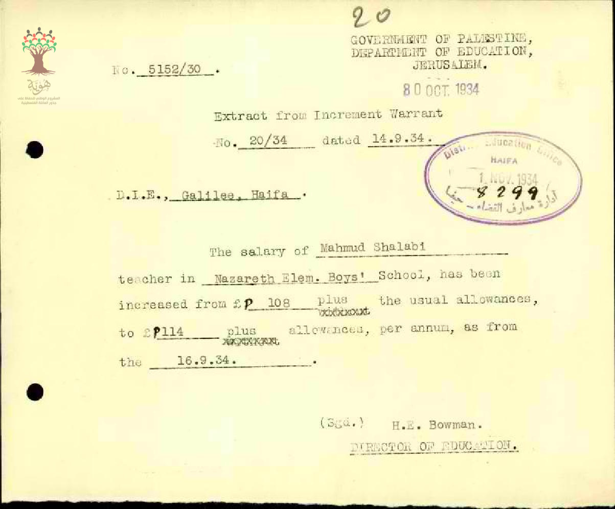 رسالة من مدير المعارف الى مفتش المعارف بخصوص زيادة راتب المعلم محمود شلبي السنوية